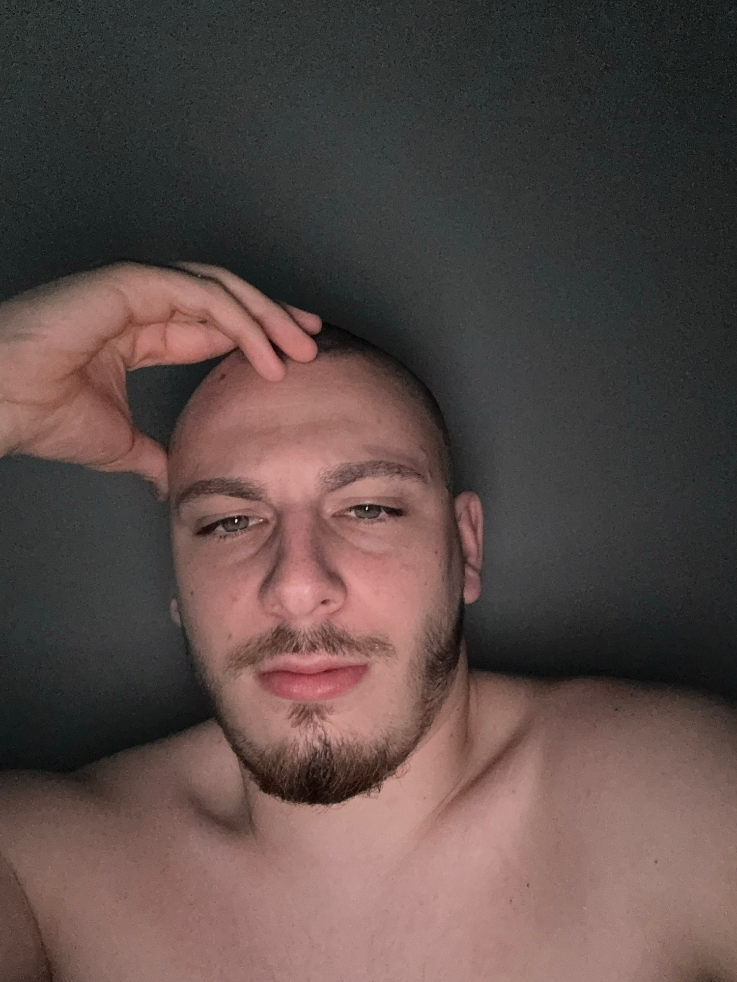 A bare-chested man with a shaved head and a beard is lying down. His head is tilted, and his hand is touching his forehead. The background is a solid dark gray. There is no indication of location in S…read more
