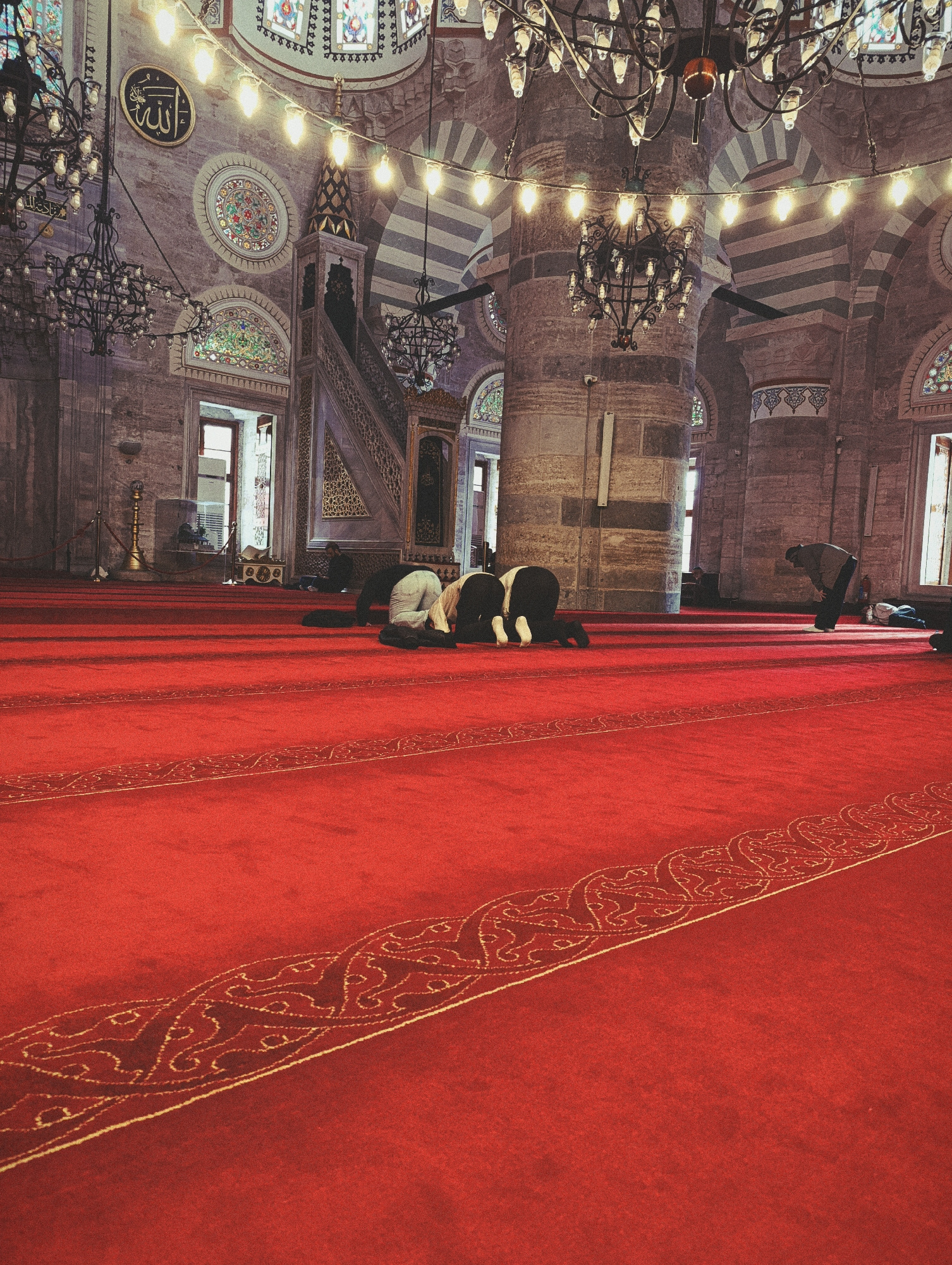 The image depicts the interior of a mosque in Üsküdar, Turkey. Several individuals are engaged in prayer on a large red carpet that dominates the foreground. The carpet features a patterned border. Ar…read more