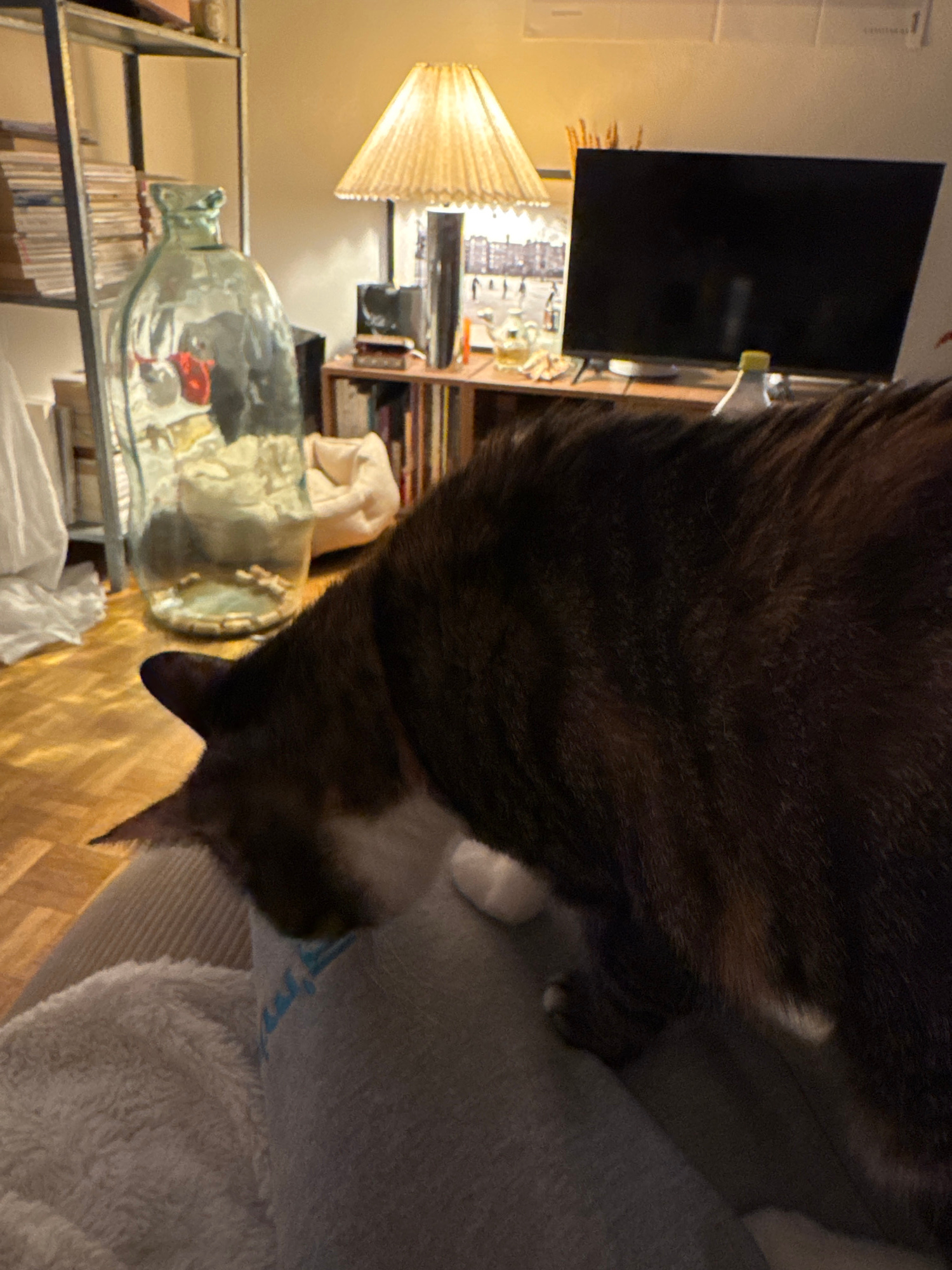 The image depicts an indoor domestic scene in Paris, France. A domestic shorthair cat, exhibiting dark brown and black tabby markings with white fur on its chest and paws, is positioned over a person'…read more