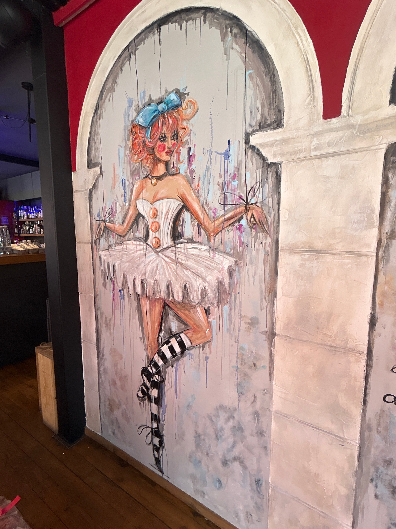 Ceiling mural in a Plovdiv, Bulgaria bar or restaurant, depicting a stylized female figure in a white tutu and striped stockings, likely a ballerina, set against a gray and white faux wood-plank backg…read more