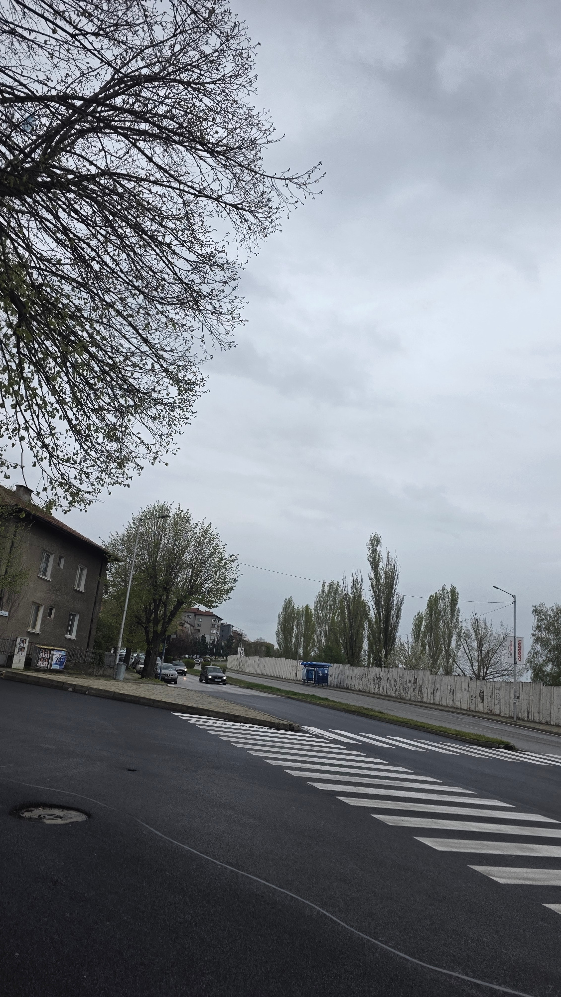 The image depicts a street scene in Blagoevgrad, Bulgaria, under an overcast sky. A bare-branched tree dominates the left foreground. To the right, a multi-story building with windows is visible. Furt…read more