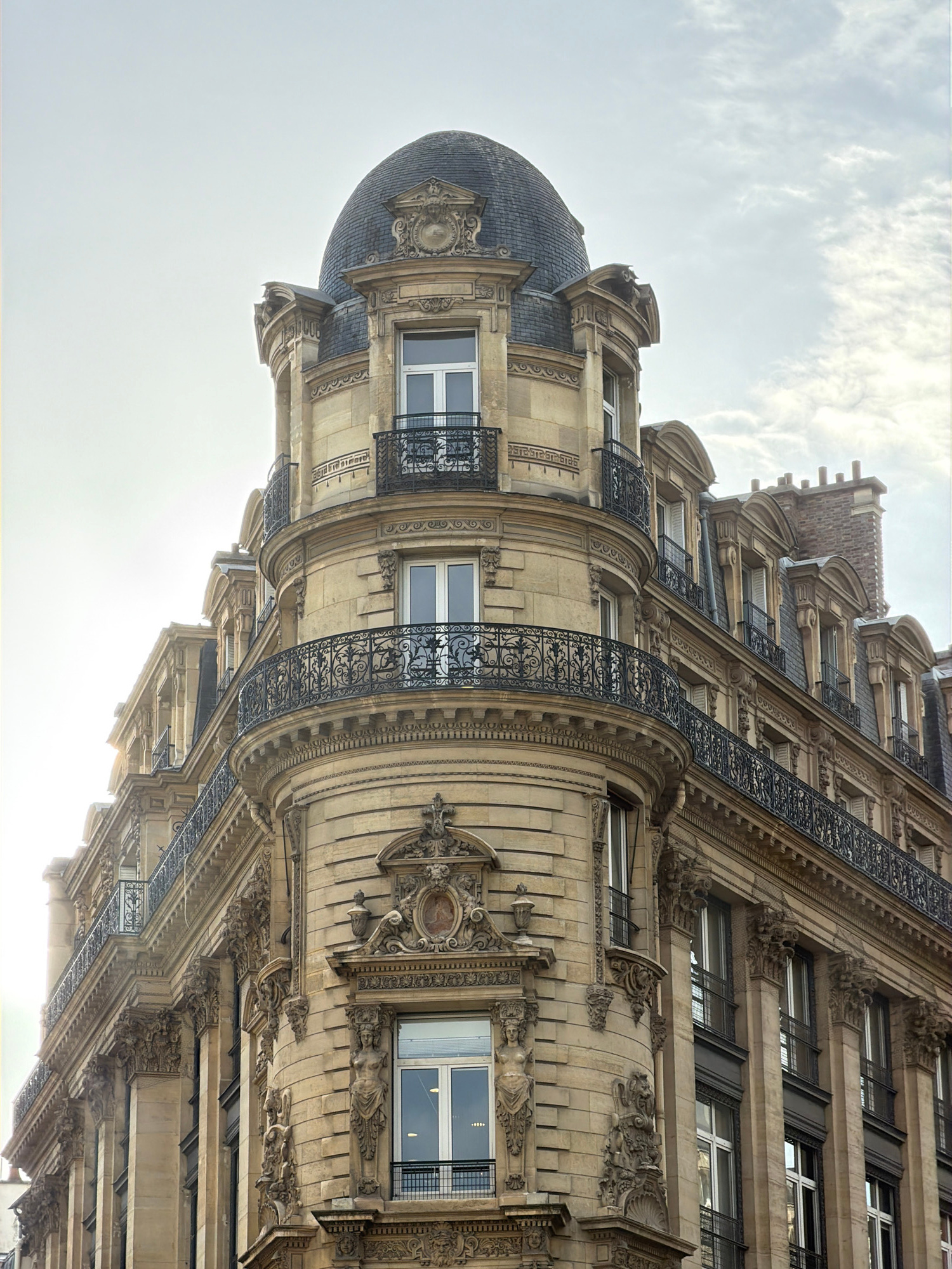 The image captures the ornate facade of a building in Paris, France. The building features a domed corner section with a slate roof and intricate stonework. The facade has multiple stories, with balco…read more