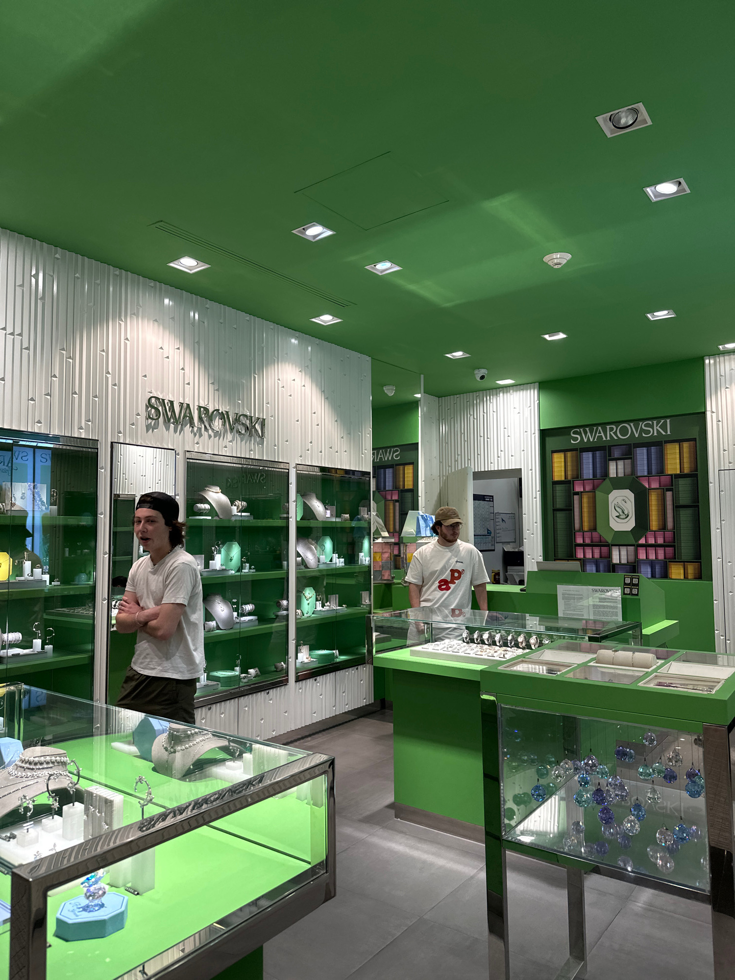 A sideways-oriented indoor shot shows the interior of a Swarovski store, presumably in Huixquilucan de Degollado, Mexico. Two people are visible: one wearing a white t-shirt, khaki pants, and a black…read more
