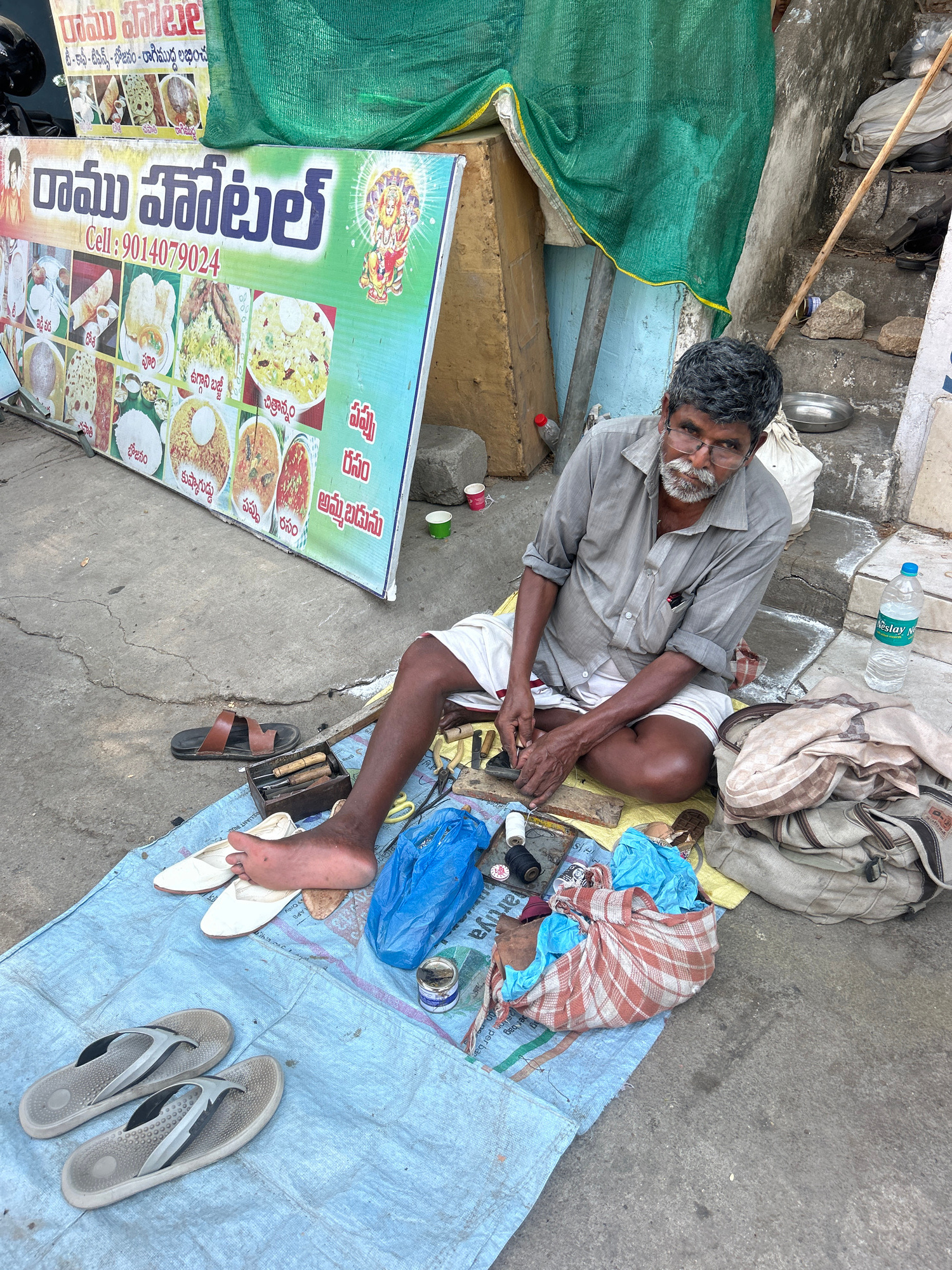 Here is a detailed description of the image: **Scene:** An outdoor scene in Puttaparthi, India. The image is taken from a high-angle perspective. A man is sitting on a blue plastic sheet spread on th…read more