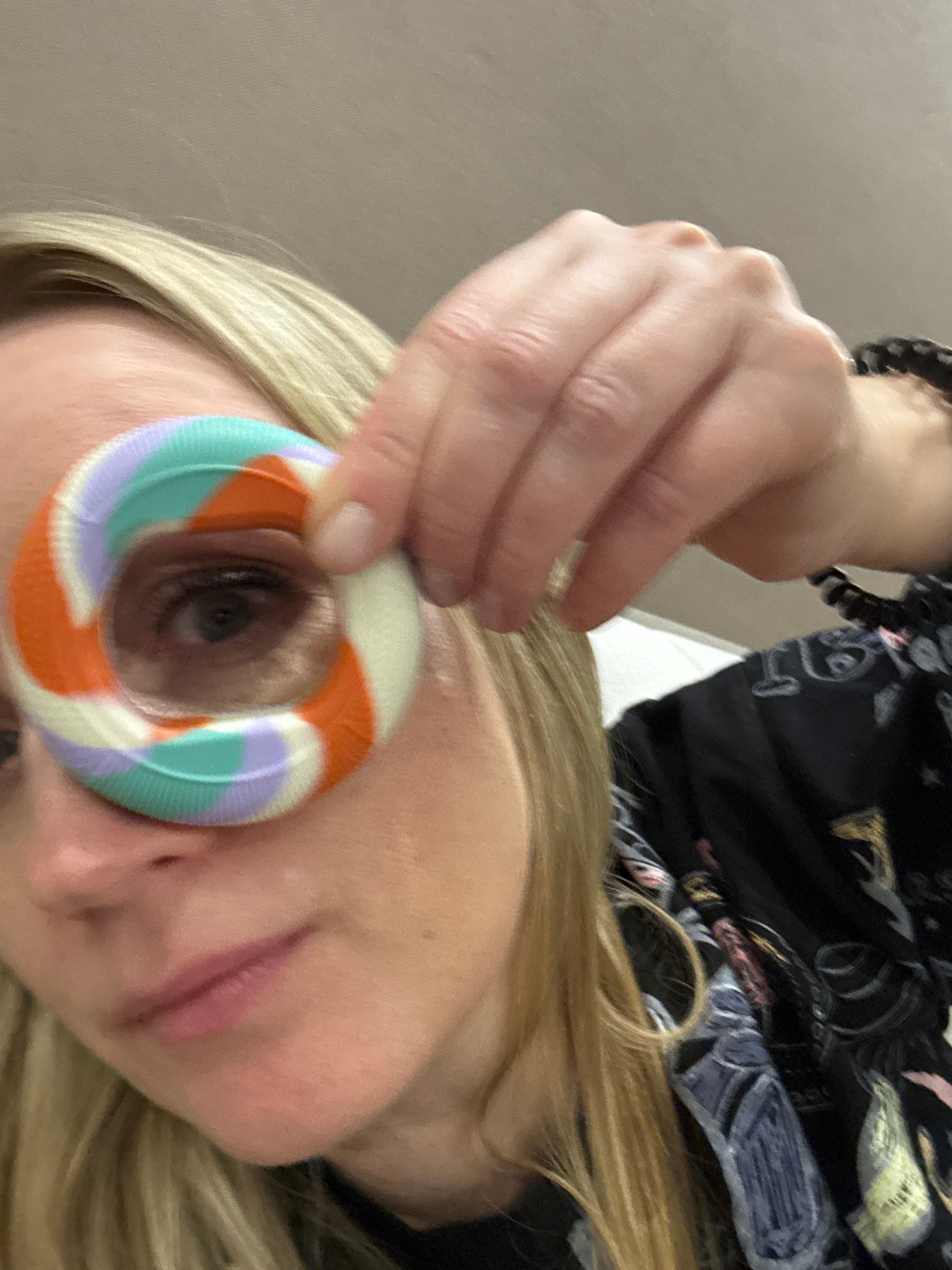 A close-up, angled image captures a subject, identified as a woman with blonde hair, centered in the frame. Her right eye is visible through the central aperture of a textured, ring-shaped object held…read more