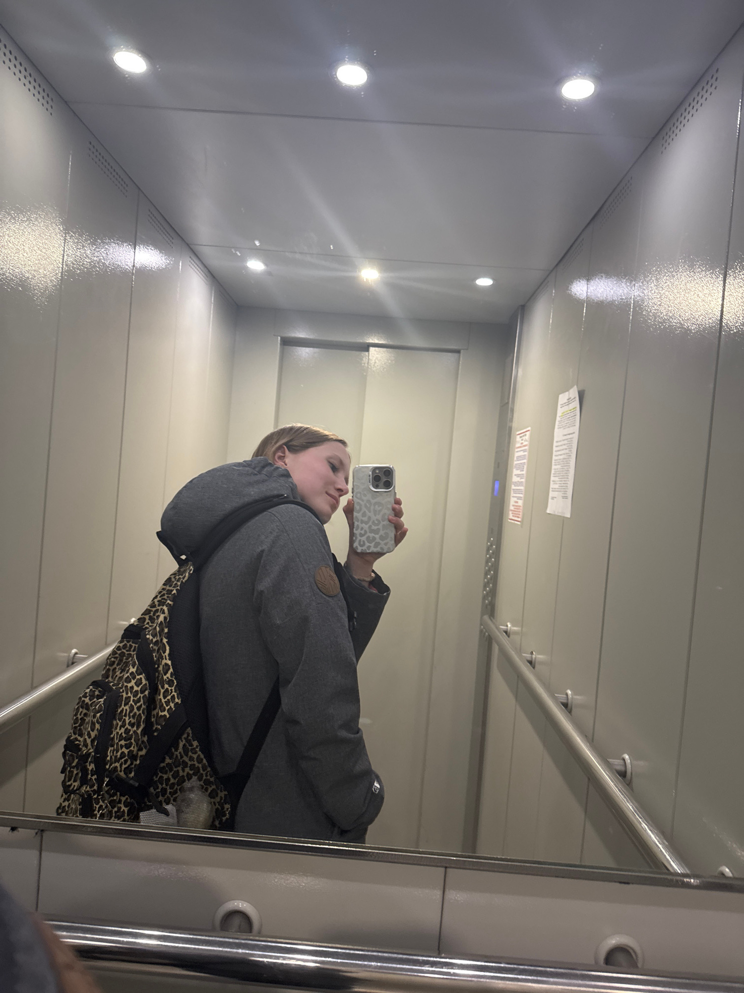 The image shows a selfie taken by a person reflected in the highly reflective interior of an elevator. The setting is an elevator, likely in Chaikovsky, Russia, given the context. A person, appearing…read more