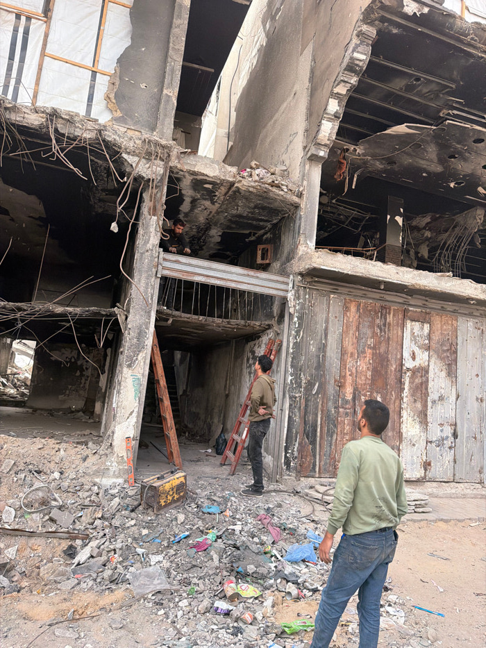 The image depicts a severely damaged multi-story building in Gaza City, Palestinian Territory, characterized by extensive structural collapse, exposed concrete slabs, and twisted rebar. The interior appears blackened, consistent with fire damage. Three men are present. One man, dressed in dark clothing, is visible on a partially collapsed upper floor, leaning over a metal railing. On the ground level below, two men are standing, both looking upwards towards the damaged structure. The man in the foreground wears a light green long-sleeve shirt and blue jeans, facing away from the camera. The other man on the ground, wearing a dark green top and dark pants, is positioned further back and to the left, also observing the building. The ground is covered with a dense accumulation of rubble, including concrete fragments, rebar, shattered glass, and assorted debris such as plastic waste and discarded items. Two red-orange step ladders are propped against the damaged edifice. A yellow portable power tool or generator is visible among the ground-level debris, along with associated cabling. A weathered, vertically striped metal shutter, partially closed, is present on the right side of the structure. | Open Wire