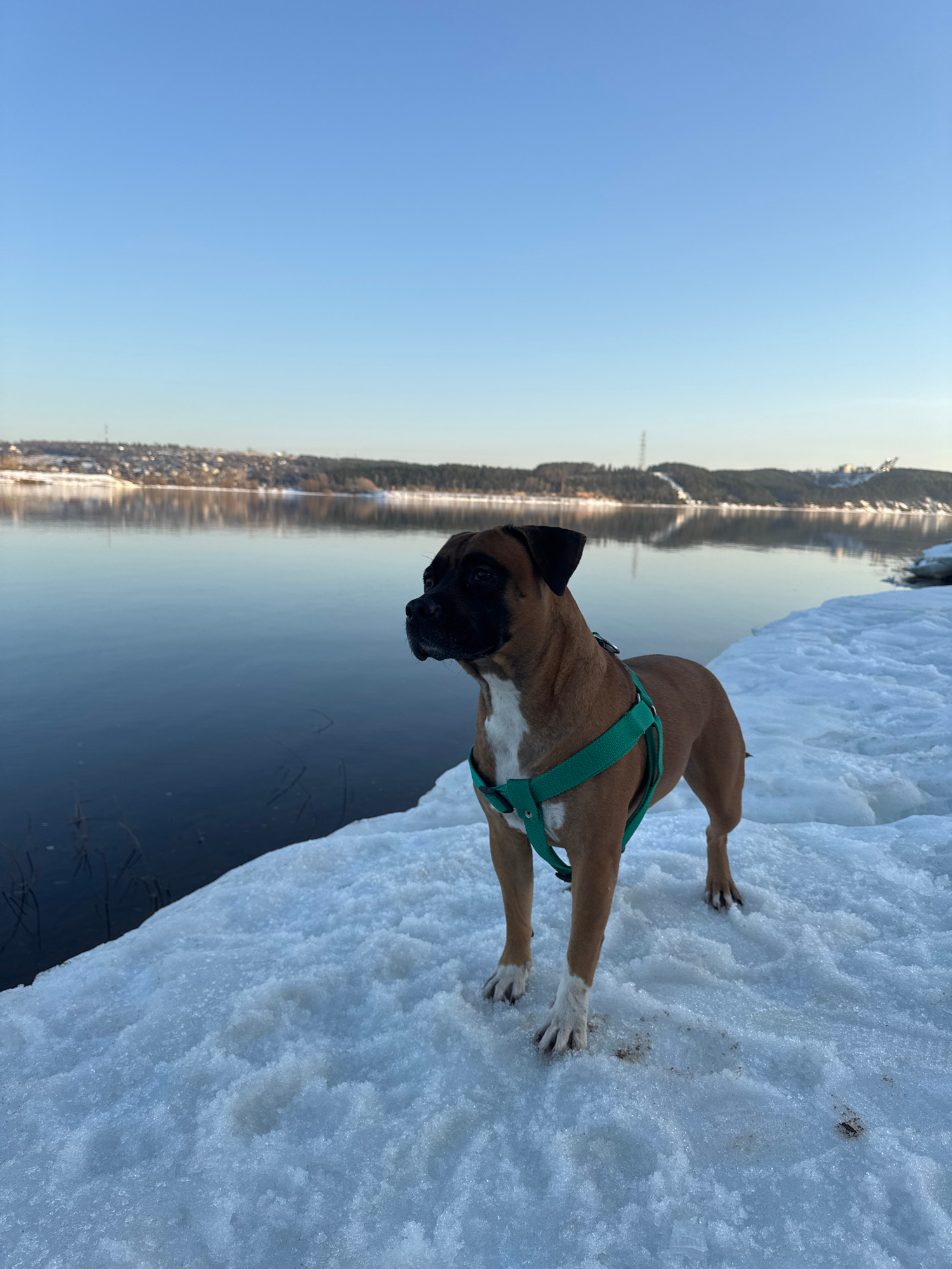A medium shot depicts a brown and white Boxer dog wearing a green harness standing on a snow-covered edge, overlooking a body of water. The water reflects the opposite shoreline, indicating a river or…read more