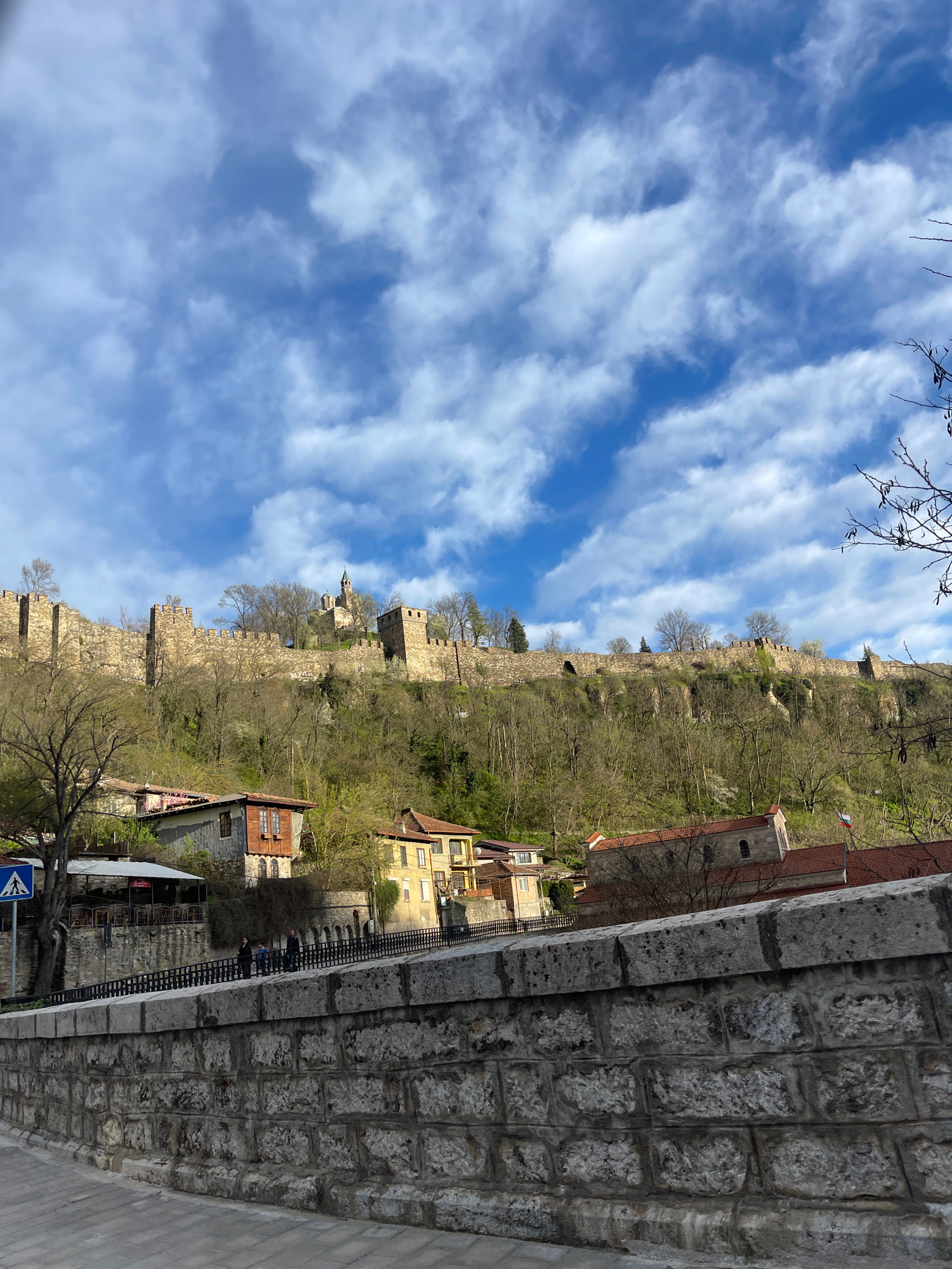 The image depicts a view in Veliko Tarnovo, Bulgaria, featuring a stone wall and fortifications along a hill. In the background, residential buildings nestle amongst trees. Above, a blue sky is partia…read more