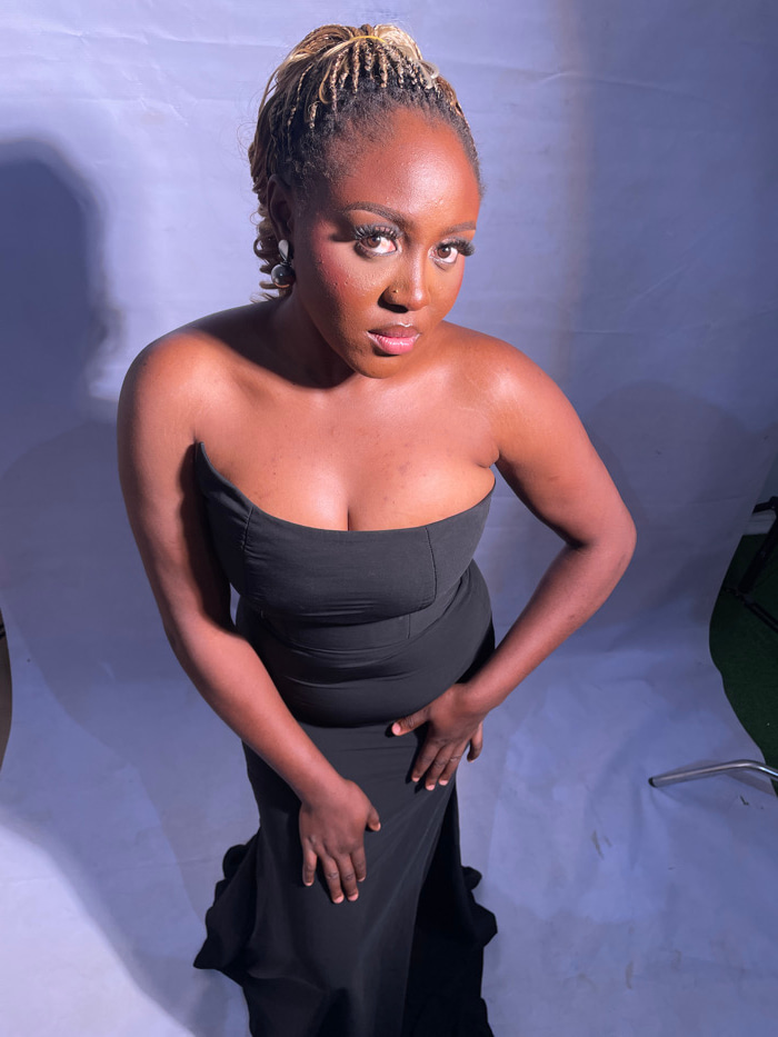 An adult female, with a medium-dark complexion and blonde micro-braids styled in a high ponytail, stands posed in a studio located in Jos, Nigeria. She is wearing a strapless, form-fitting, floor-leng…read more