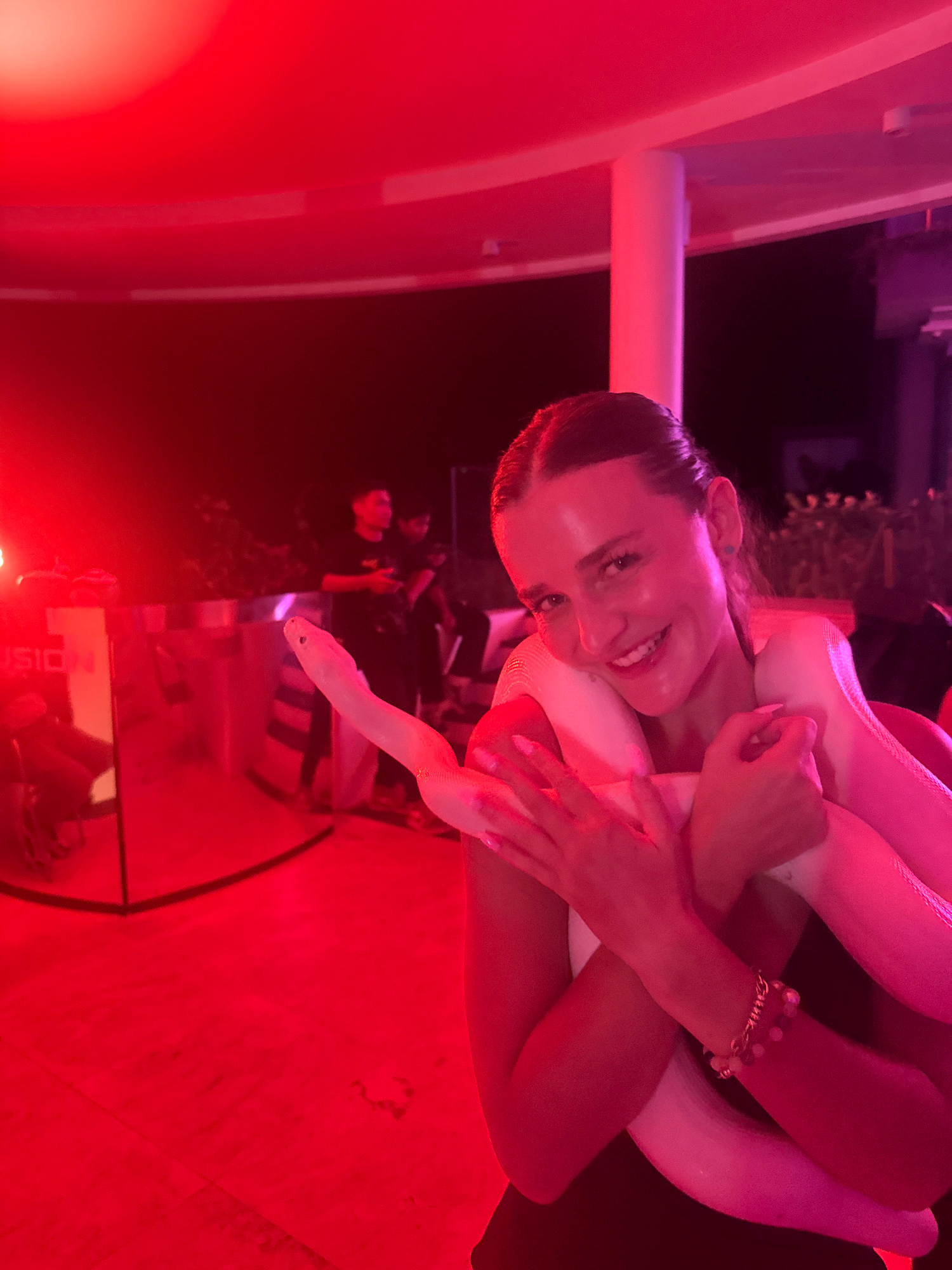 A female subject is photographed at night under strong red illumination in Pecatu, Indonesia. She is centered in the foreground, smiling directly at the camera. She possesses dark hair pulled back and…read more