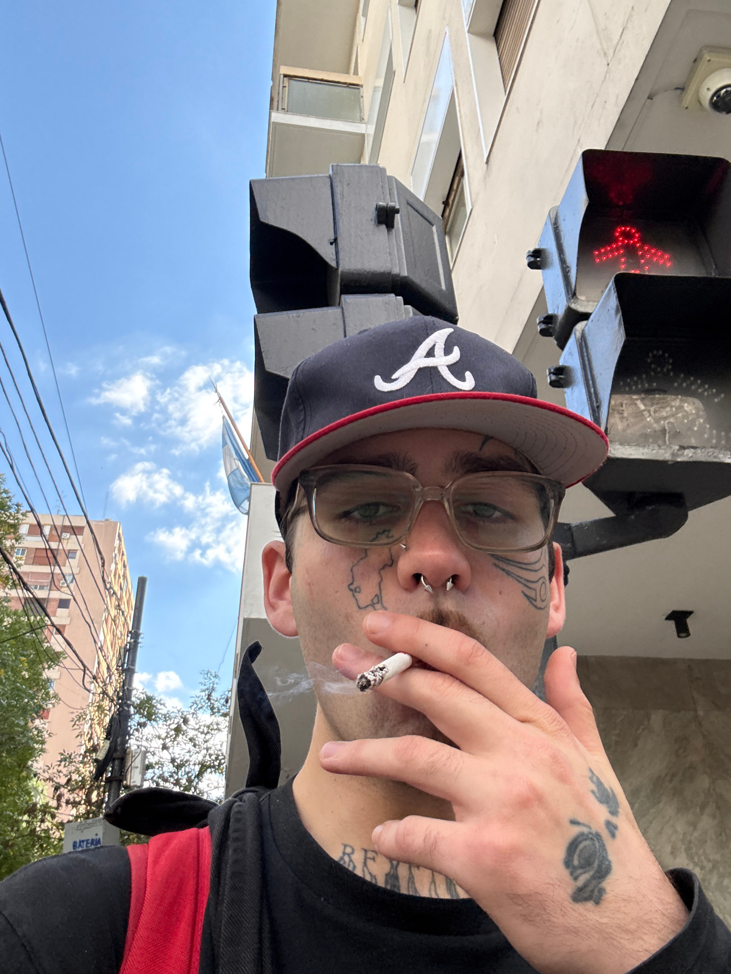 The image depicts a person with facial and hand tattoos, wearing glasses and a baseball cap with an "A" logo, and smoking a cigarette. The person has nose piercings. Behind them, a pedestrian traffic…read more