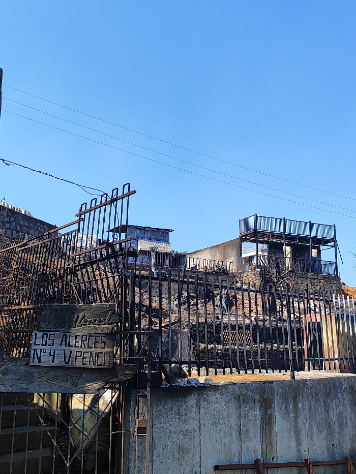A severely fire-damaged building stands behind a scorched metal gate and concrete wall. The structure features multiple levels with open-air platforms. The charred remains of what appears to be a home…read more