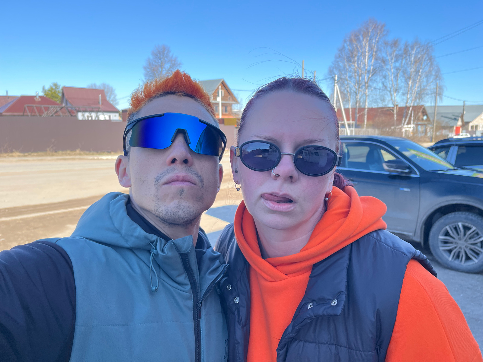 Two individuals, a woman and a man, are positioned upside down in the frame. The woman on the left is wearing sunglasses, an orange hoodie, and a black vest. The man on the right is wearing blue sungl…read more