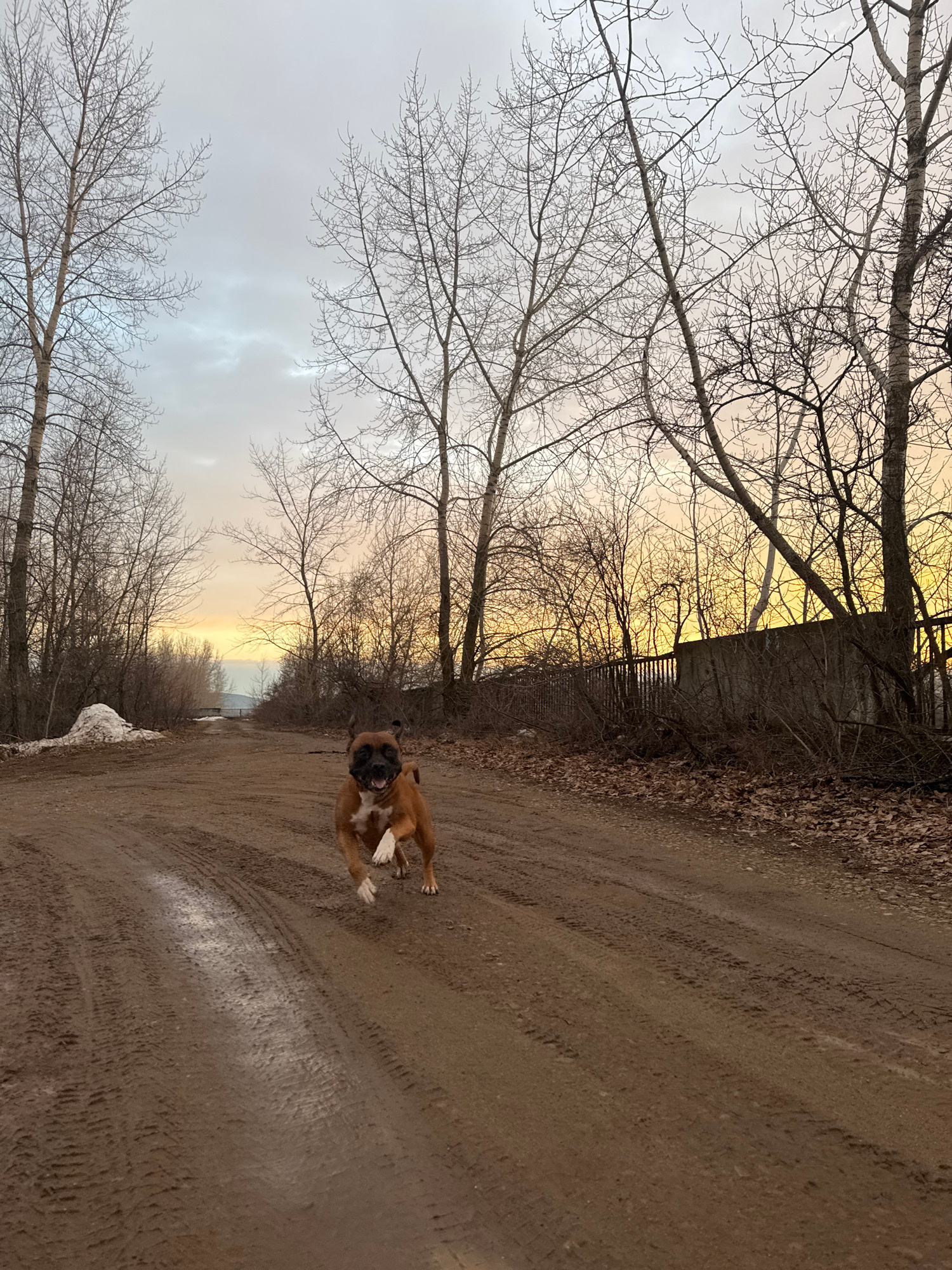 A medium shot, taken horizontally, shows a boxer dog running towards the viewer on a muddy road in a rural area of Chaikovsky, Russia. The sky is overcast with a hint of golden sunlight visible near t…read more