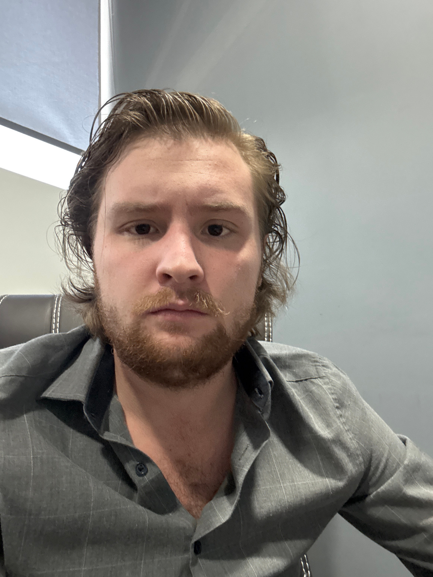 A fair-skinned man with light brown hair and a beard is shown from a low-angle perspective. His hair appears wet. He is wearing a gray, button-down shirt. The background consists of a plain gray wall and what appears to be a window or light source. The location is likely indoors, but there are no details to suggest it is in Cuautitlán Izcalli, Mexico. | Open Wire