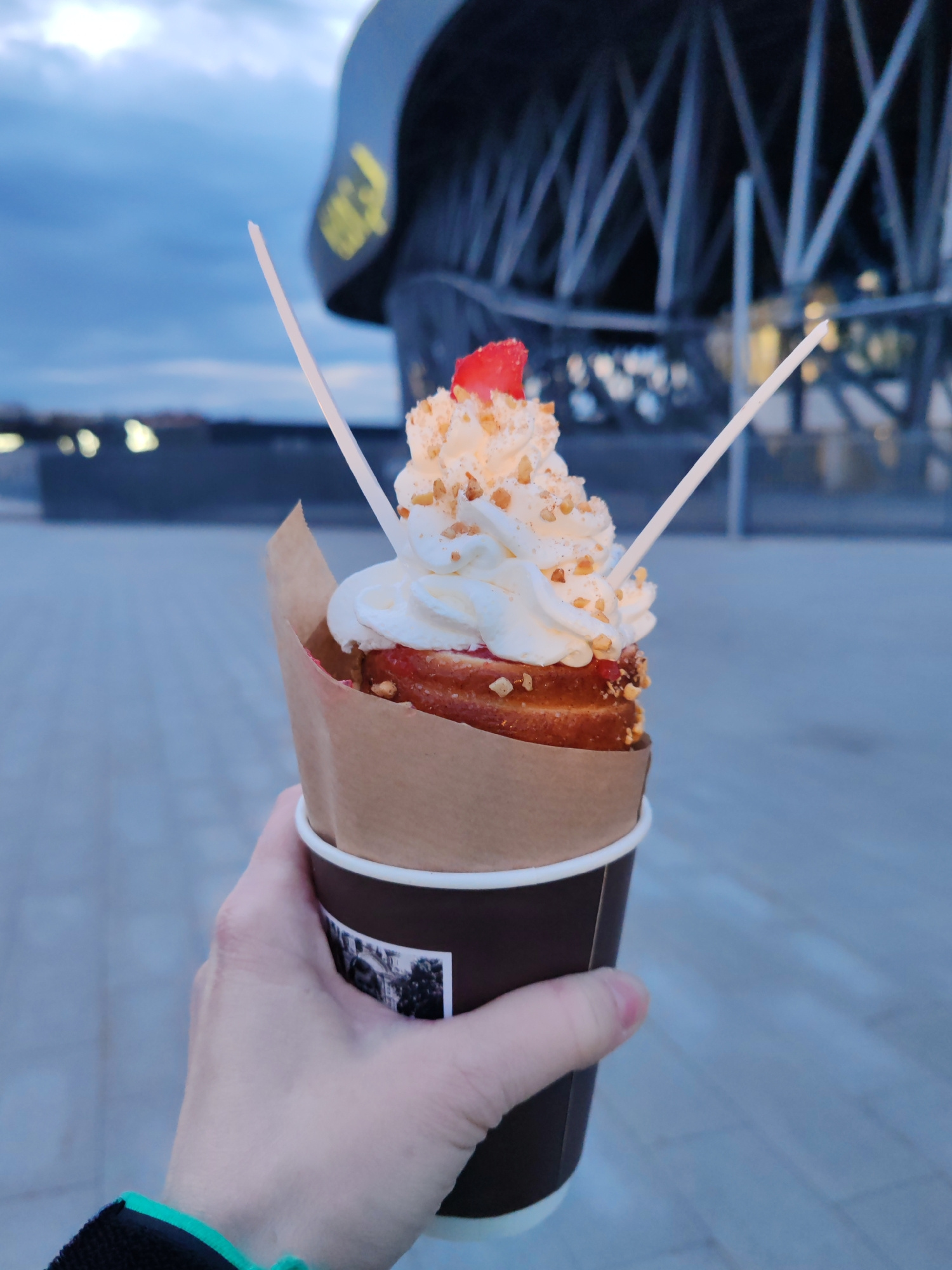 A person's hand holds a dessert in a paper cup, set against the backdrop of a large, modern stadium in Saint Petersburg, Russia, during dusk or early evening. The main subject is a close-up of a righ…read more
