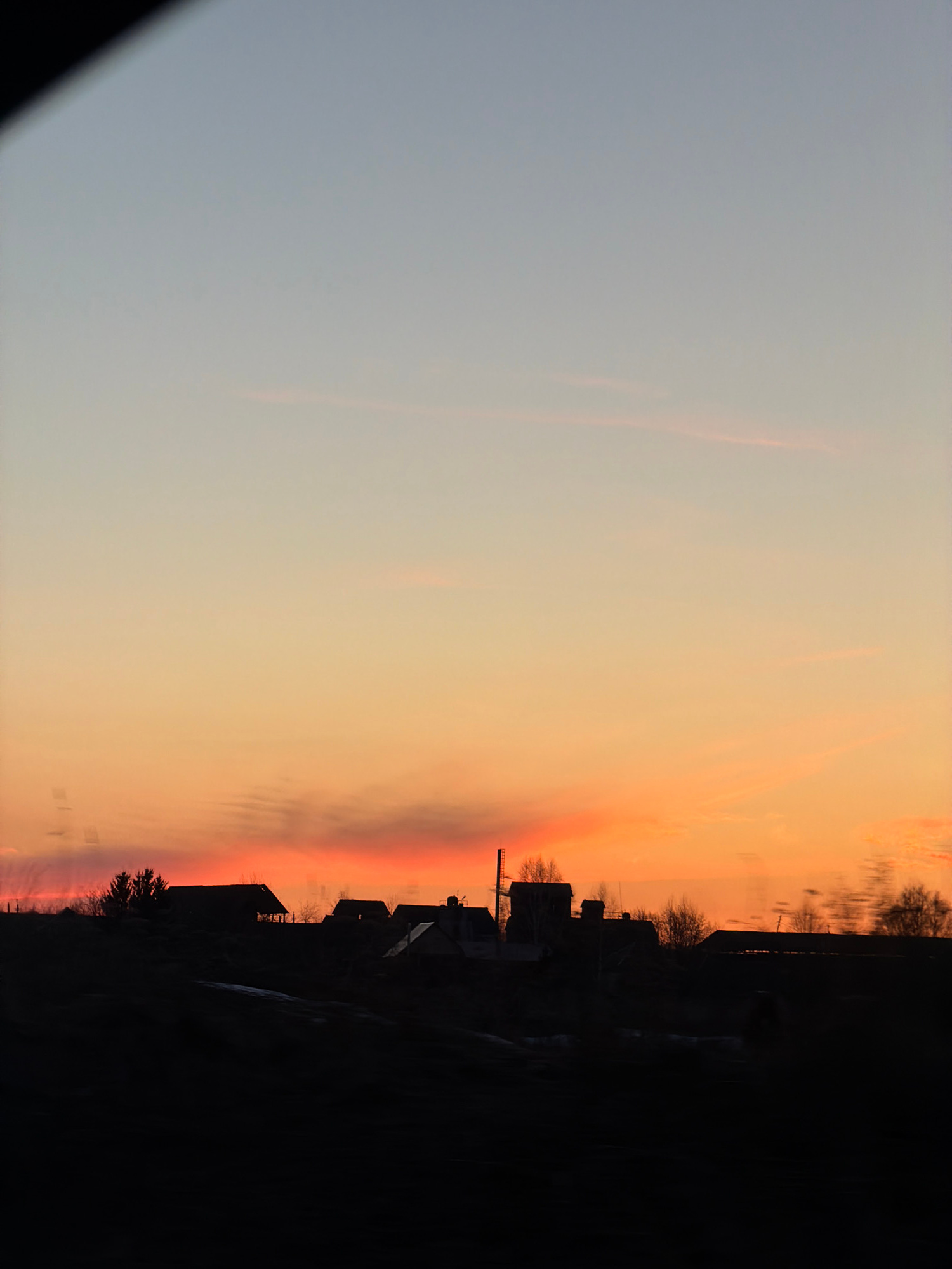 The image depicts a sunset over a location in Gory, Russia. The sky transitions from light gray to orange and red. Silhouetted against the sky are houses and trees. The lower right portion of the imag…read more