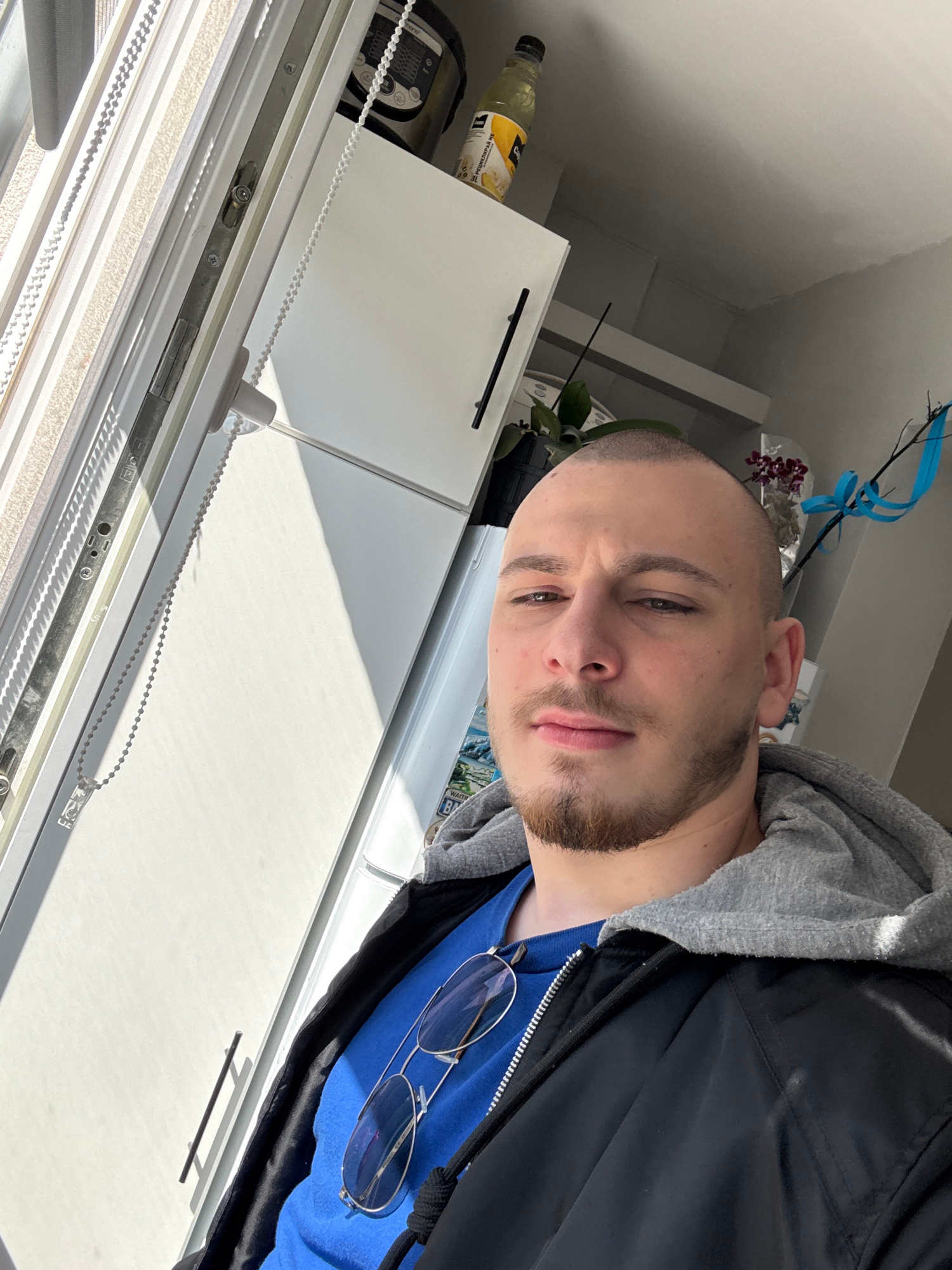 A man with a shaved head and a beard is shown from the chest up. He is wearing a blue shirt, a gray hoodie, and a black jacket. Sunglasses are on his shirt. The background is a window with closed blinβ¦read more