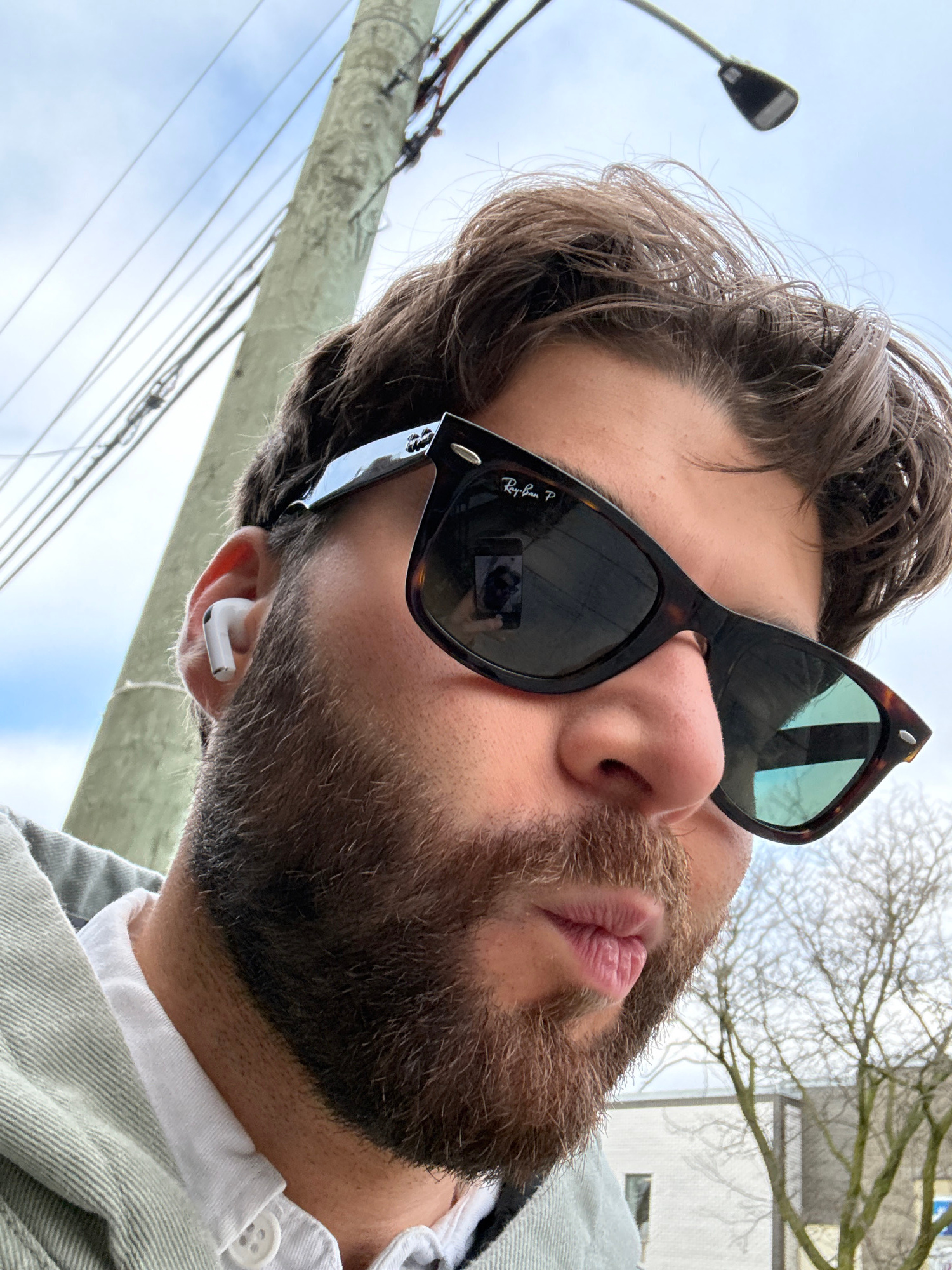 A tilted, low-angle close-up portrait features a man outdoors, likely in Montreal, Canada. He has medium-length dark brown hair and a dark, well-groomed beard. He wears tortoise-shell Ray-Ban sunglass…read more