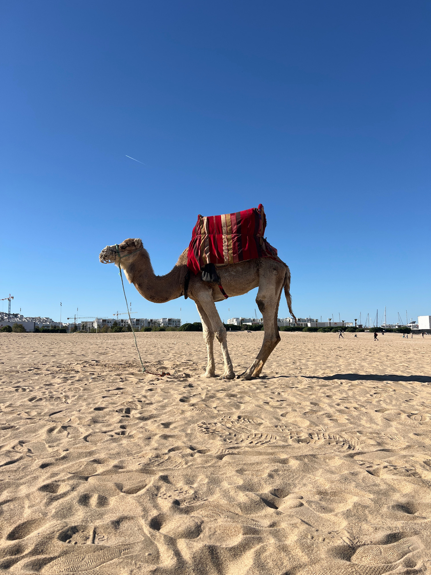 A camel stands on a sandy beach under a clear blue sky. The camel is equipped with a red and gold saddle. The beach shows footprints and is adjacent to a cityscape with buildings, cranes, and light po…read more