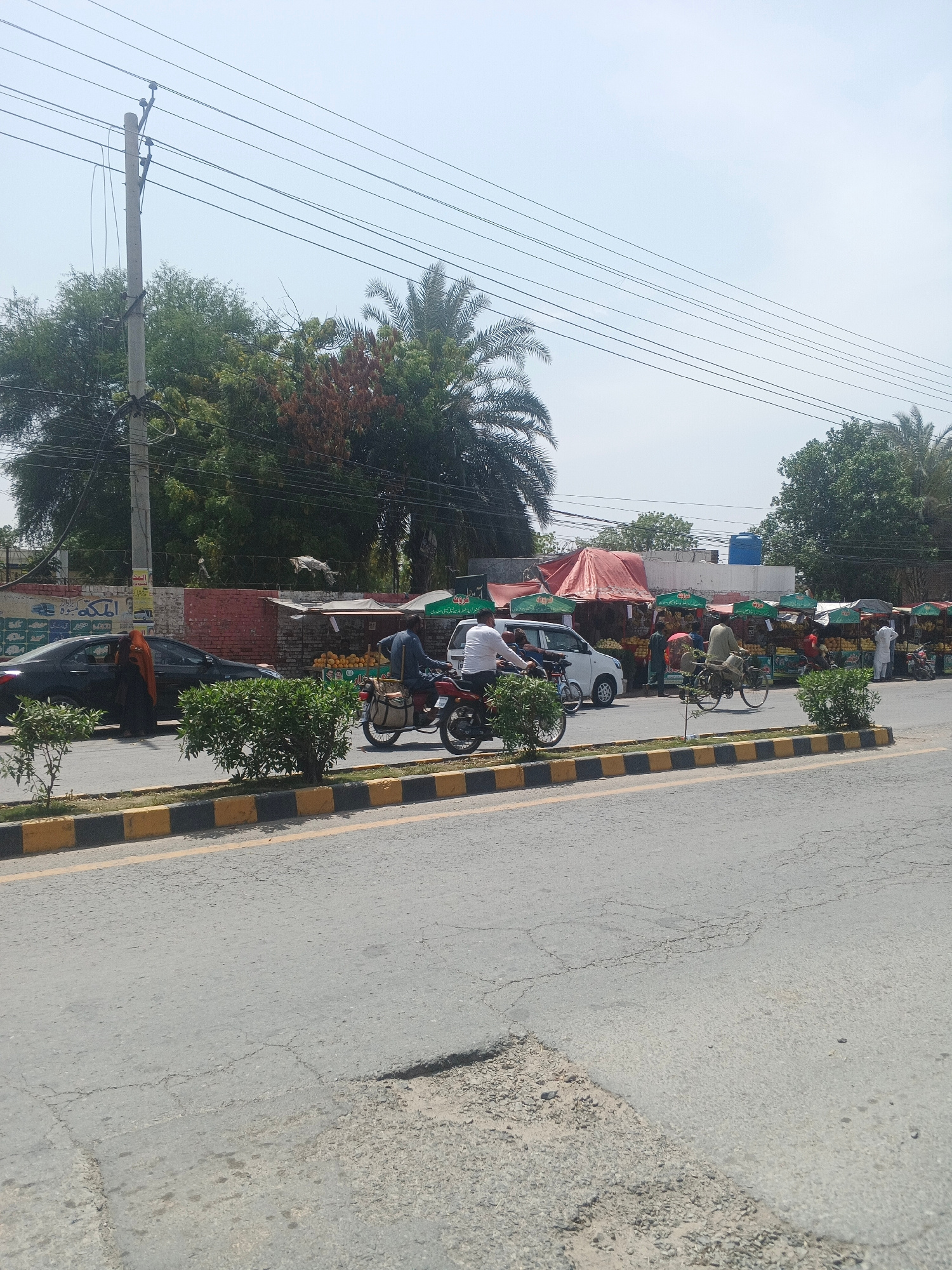 This image captures a vibrant street scene in Samundri, Pakistan, depicting daily life and commerce under a clear, sunny sky. In the foreground, a wide asphalt road, showing signs of wear with visibl…read more