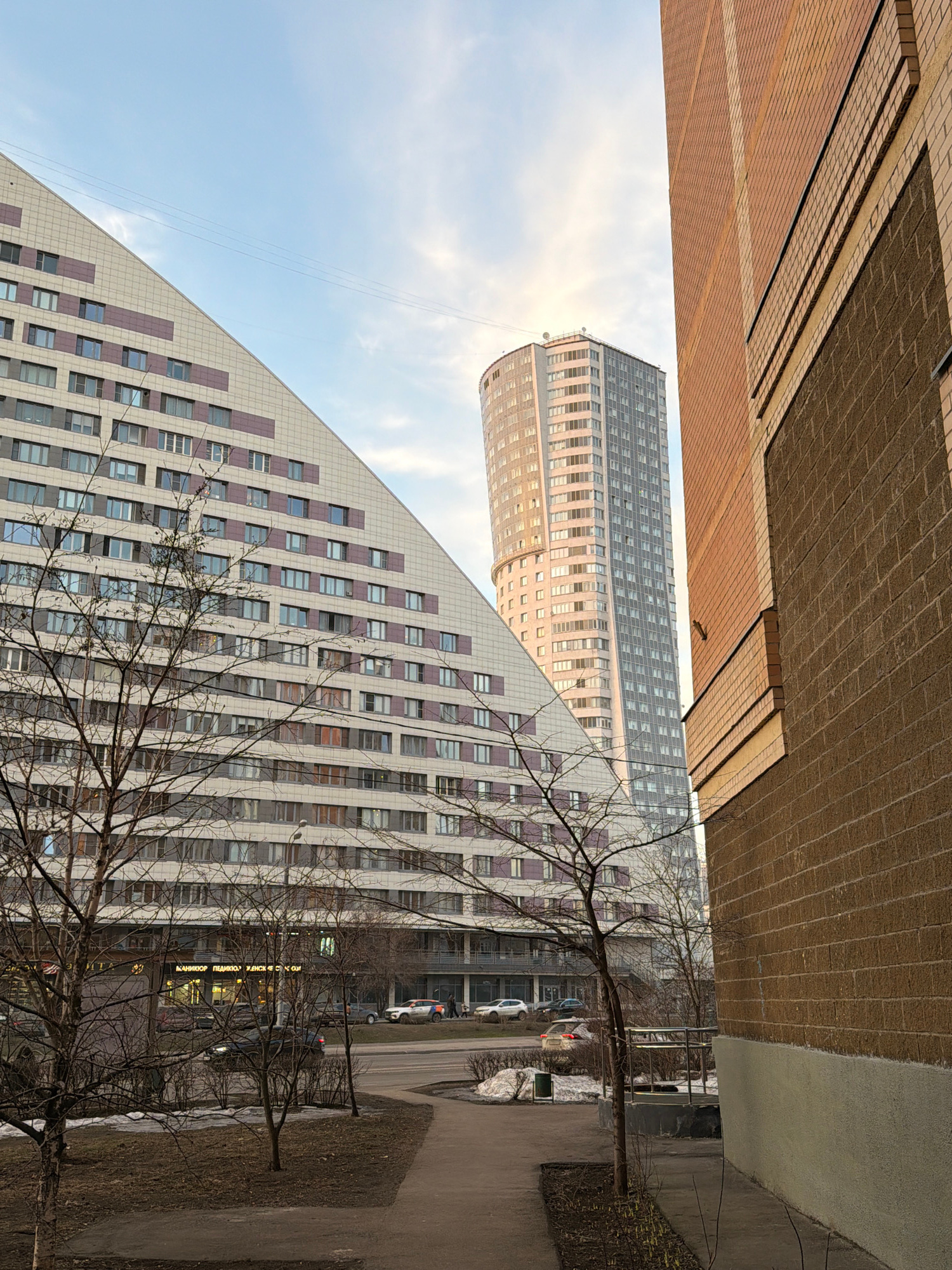 The image depicts an urban street scene in Khimki, Russia, specifically featuring the "Capital of the World" residential complex around Ulitsa Moskovskaya. In the foreground, a paved concrete path cu…read more