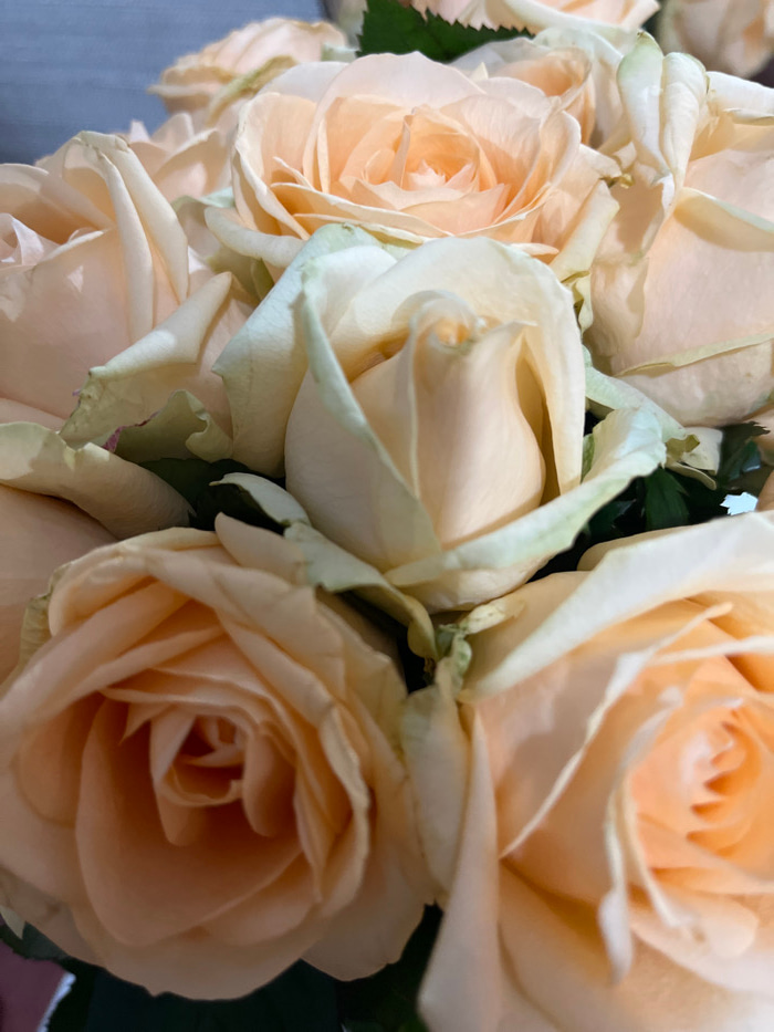 A cluster of light peach-colored roses fills the frame. Petals are tightly curled at the center, gradually unfurling outward, showing delicate texture and shading. Hints of green foliage are visible a…read more