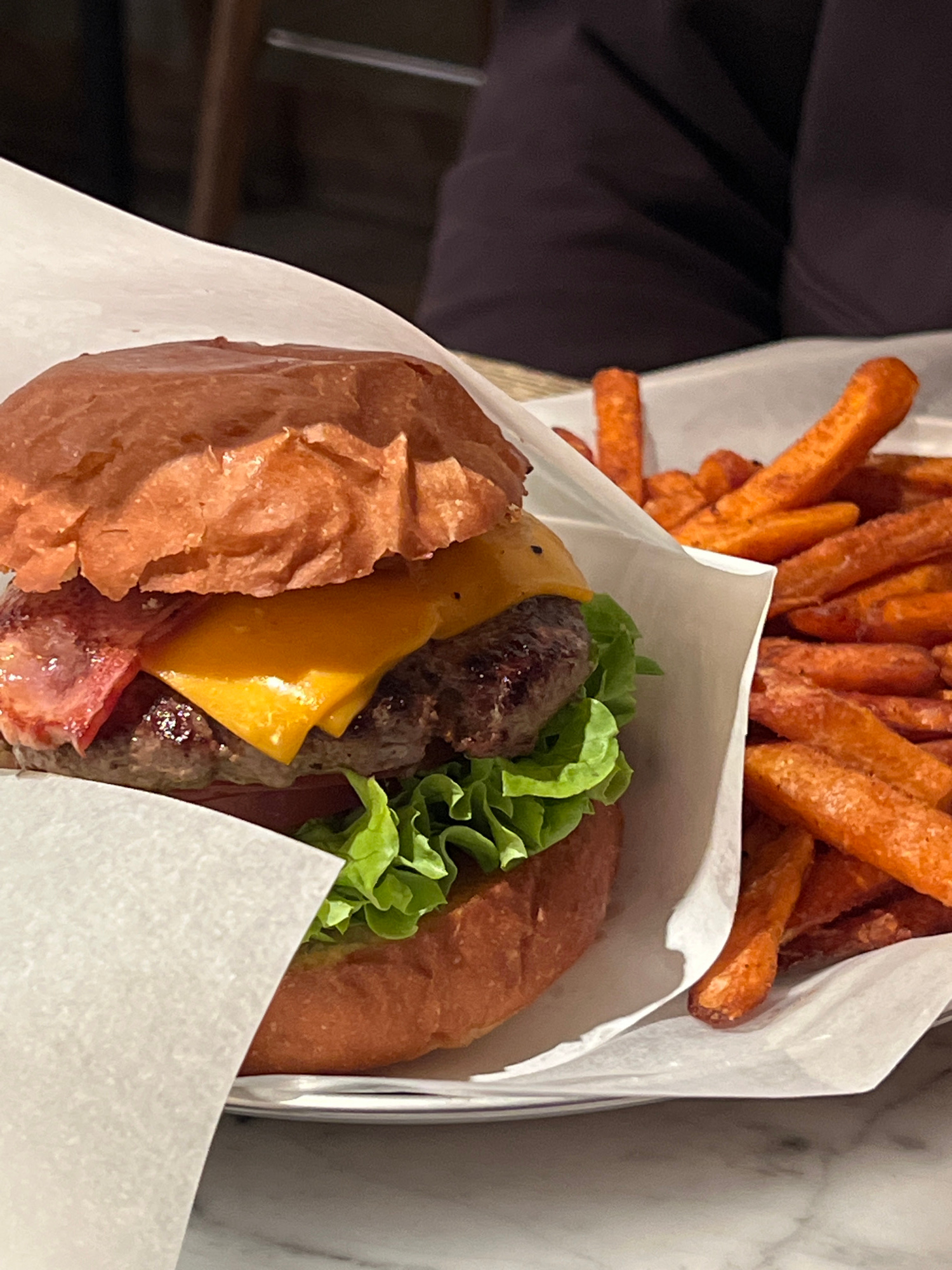 The image captures a close-up view of a hamburger and sweet potato fries, presented in white paper packaging, likely indoors at a restaurant or casual eatery. In the foreground and center, a hamburge…read more