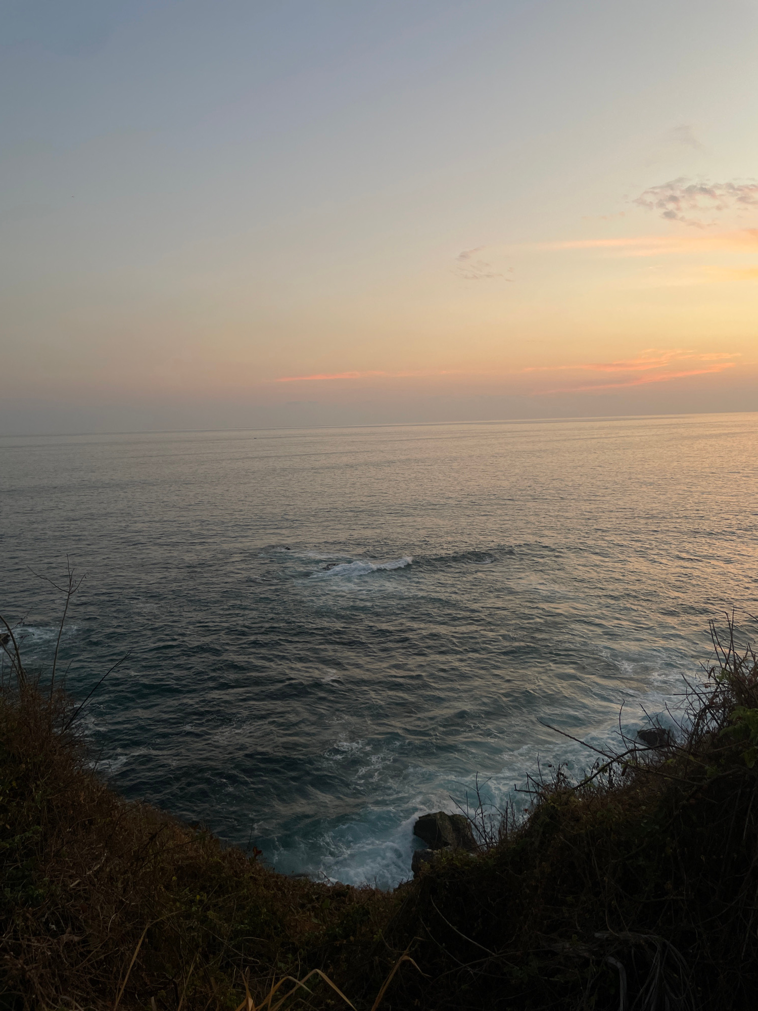 The image captures a view from a cliff overlooking the ocean, likely at sunset or sunrise due to the soft orange and grey hues in the sky. The sea is visible and waves are breaking against the rocks a…read more