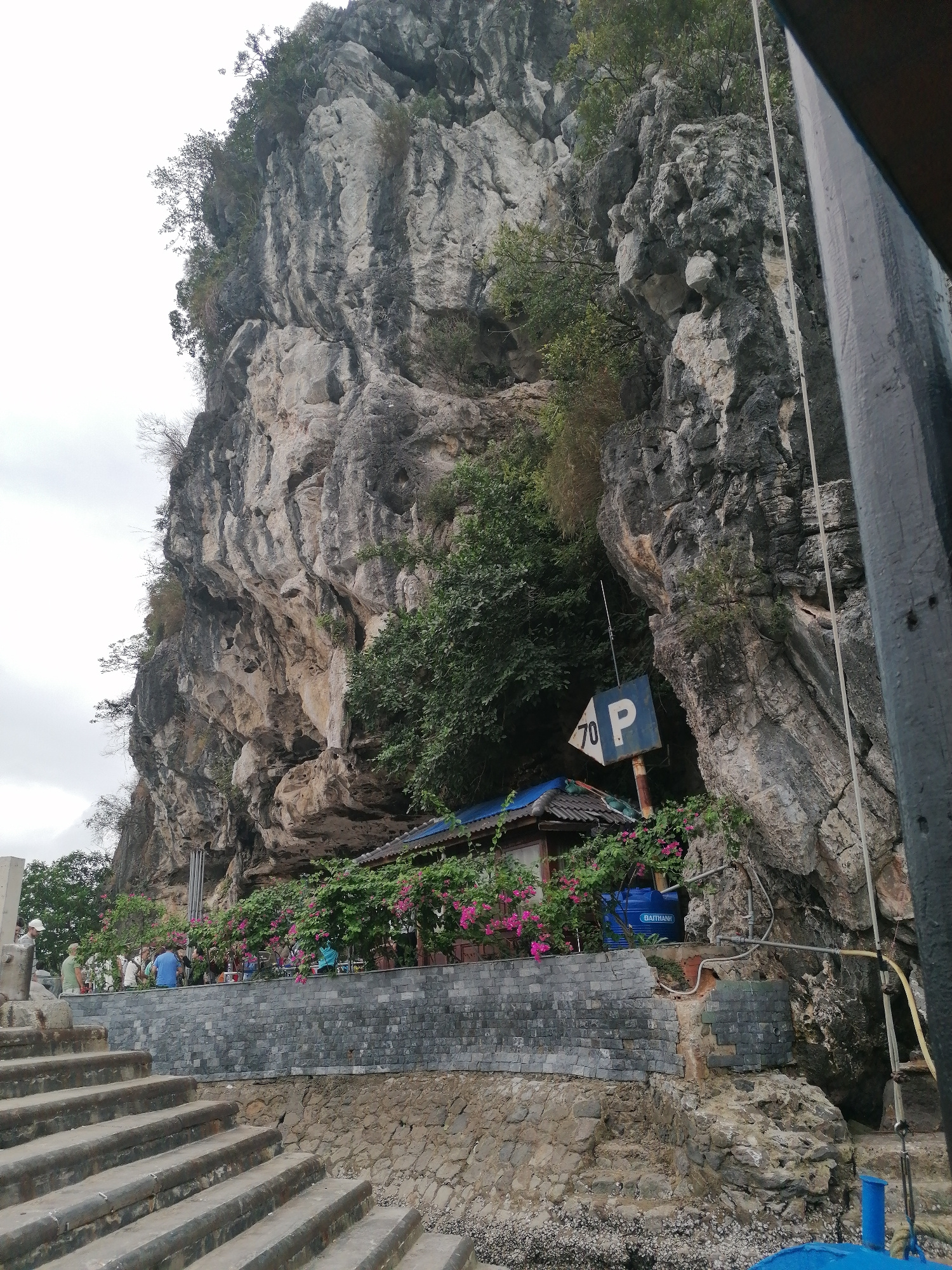 This media file presents a scenic view of a towering, rugged limestone karstic cliff, a geological feature typical of Ha Long Ward, Vietnam. The immense rock face, textured in shades of grey and tan,…read more