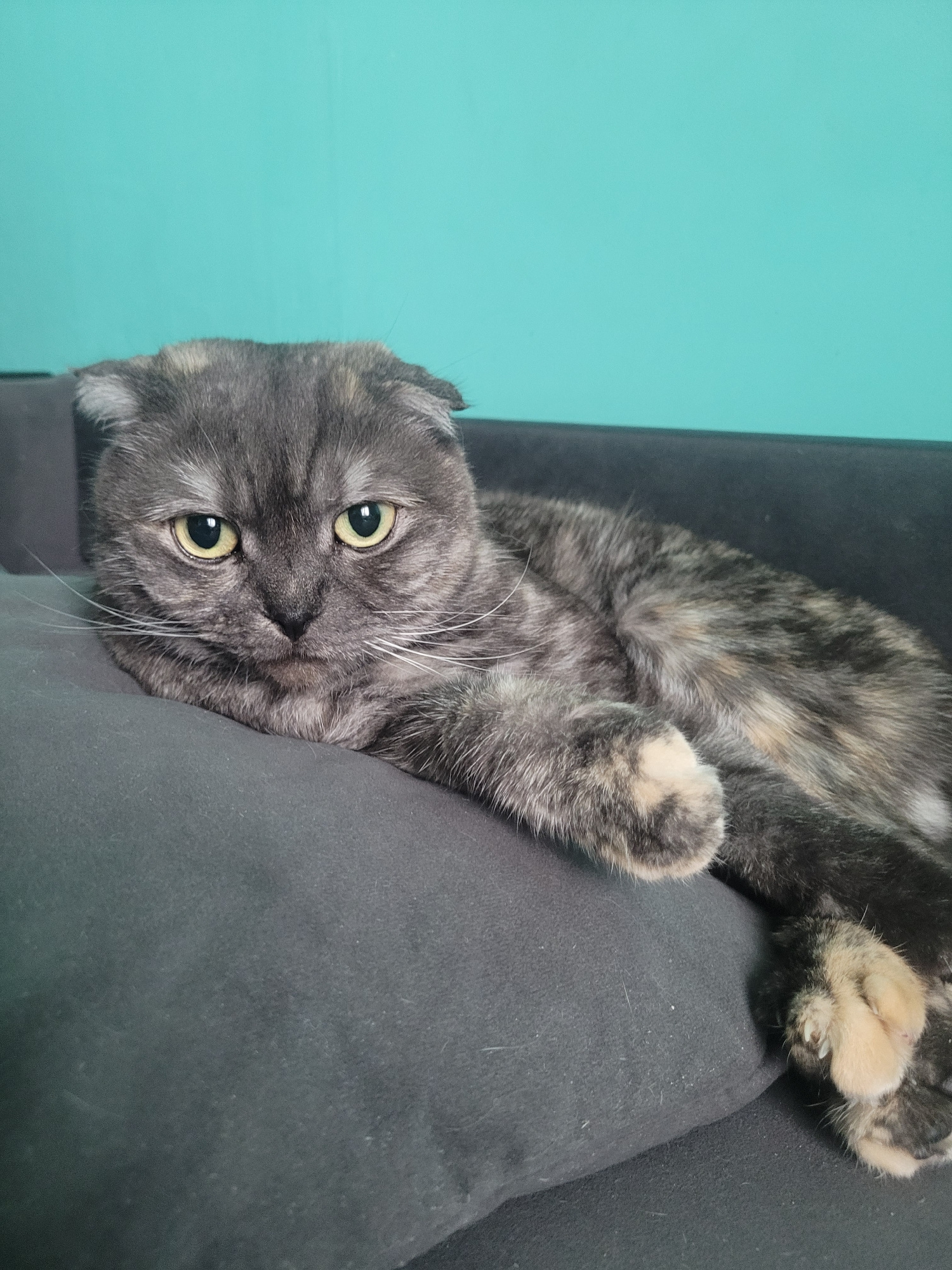 A tortoiseshell Scottish Fold cat is lying on its back on a dark gray surface. The cat's head is tilted to the left, and it is looking directly at the camera with round, yellow eyes. The cat's paws ar…read more