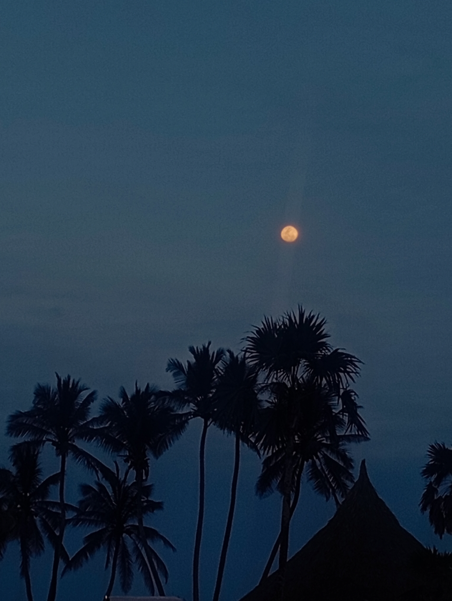 The image captures a night scene in Playa El Agua, Venezuela, featuring a row of silhouetted palm trees against a dark blue sky. A bright, round moon is visible in the upper portion of the frame. In t…read more