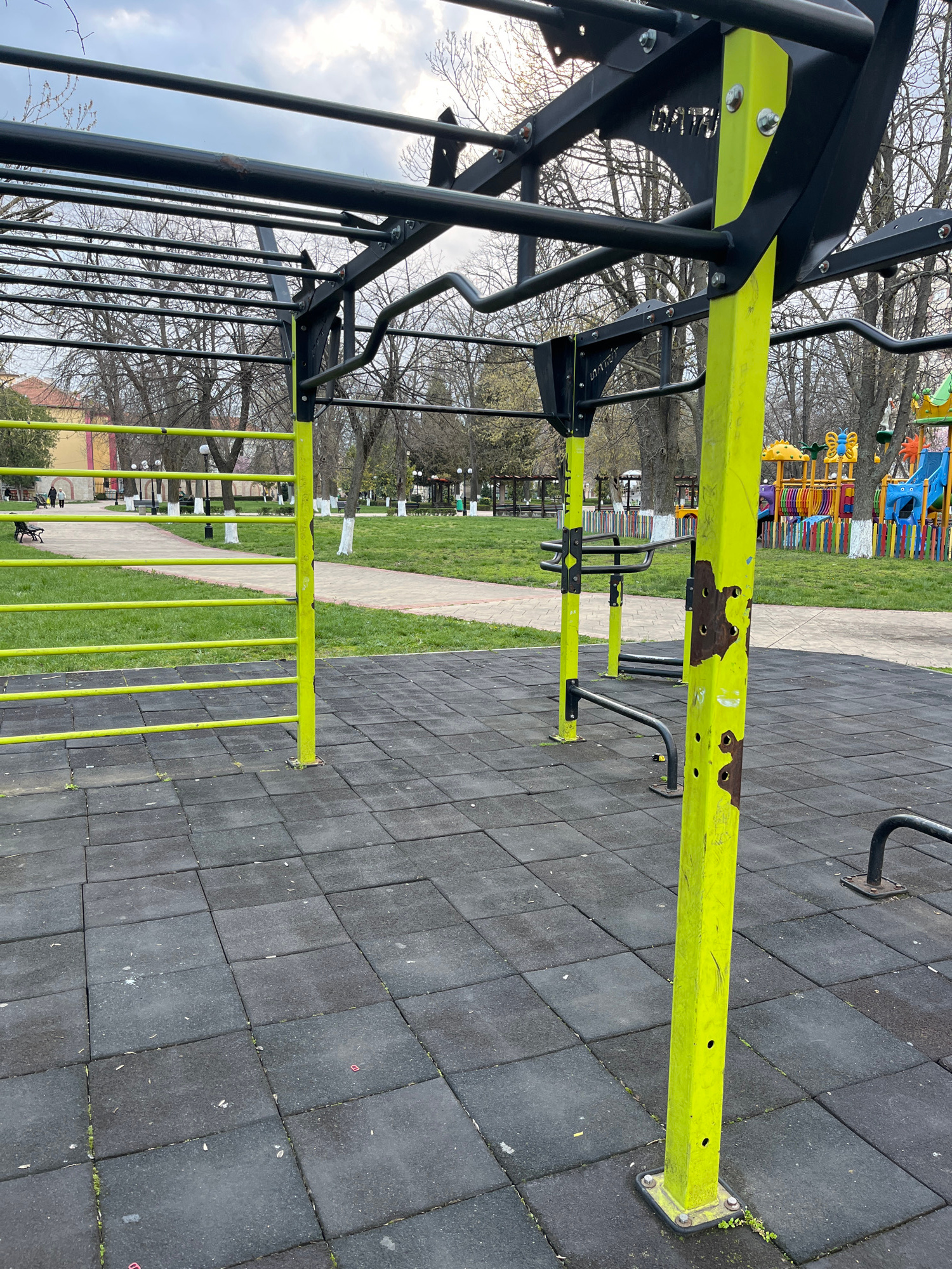 The image shows a playground or outdoor fitness area in Nova Zagora, Bulgaria. It features a set of monkey bars and other exercise equipment made of black and yellow metal. The equipment appears to be…read more