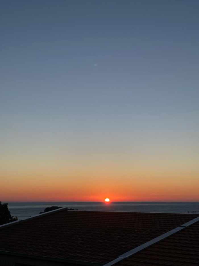 The image shows a vivid sunset over water, with the orange sun low on the horizon. The sky transitions from blue to orange near the sun. A dark, angled roof occupies the right side of the frame. The s…read more