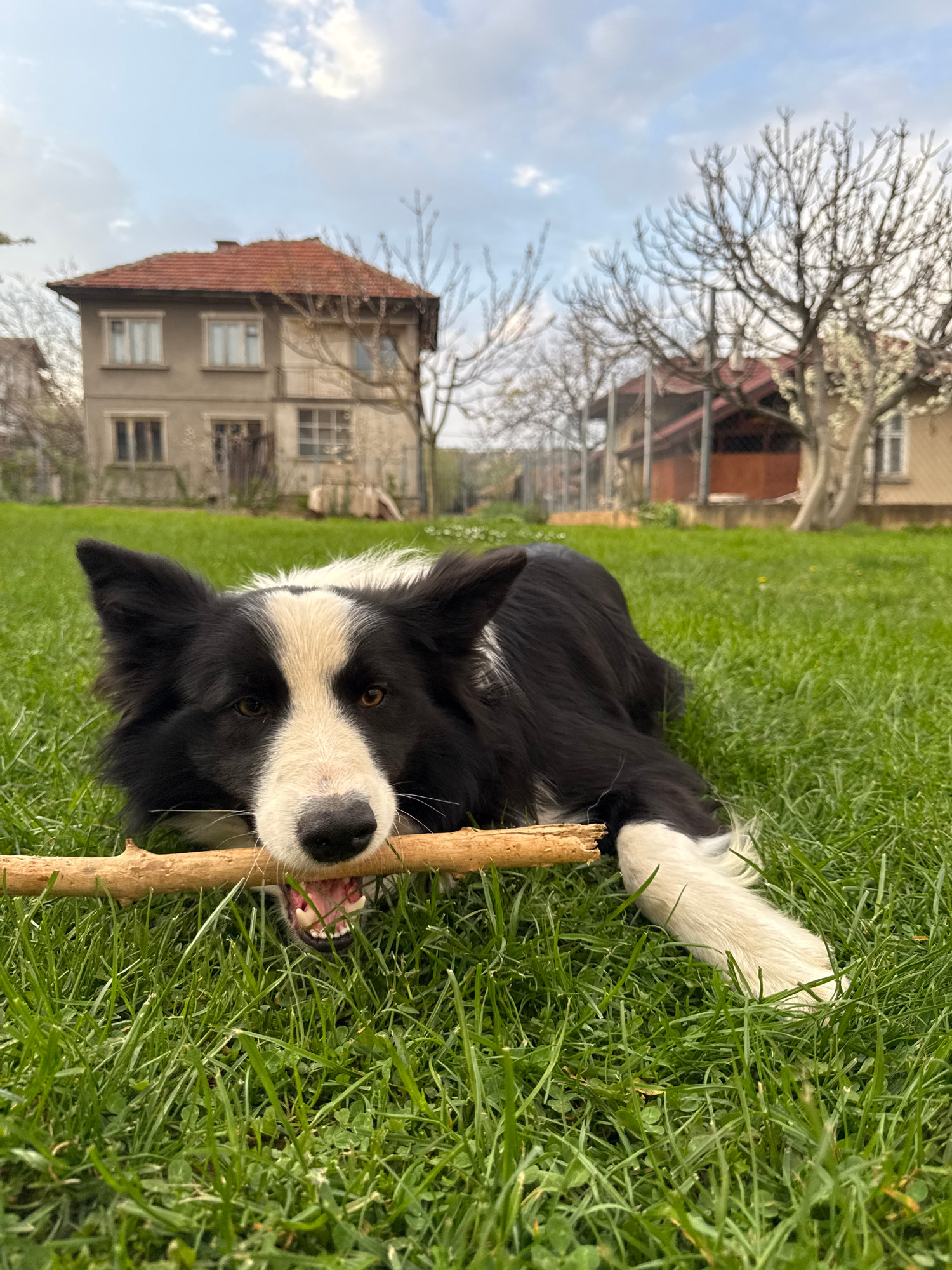 A Border Collie dog lies on its side in a grassy yard in Berkovitsa, Bulgaria, gnawing on a stick. The dog is black and white, with its head toward the camera. A section of its white tail is visible i…read more