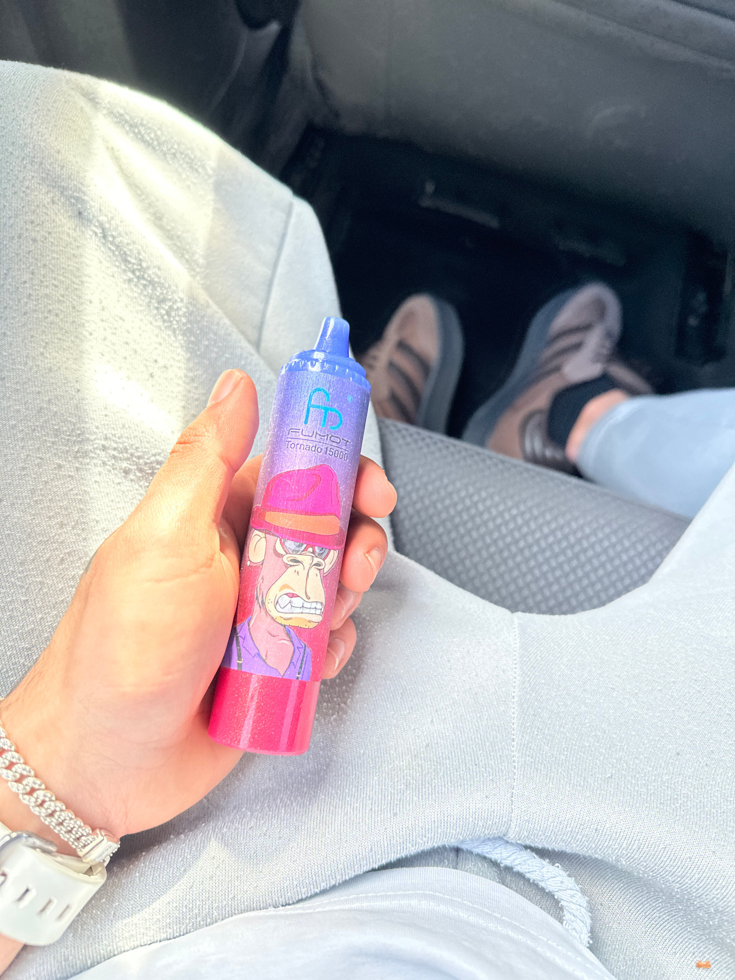 A person is seen holding a FUMOT Tornado 15000 disposable vape in their hand, inside a vehicle. The vape is pink and purple and features a cartoon character on its side. The person is wearing a white…read more