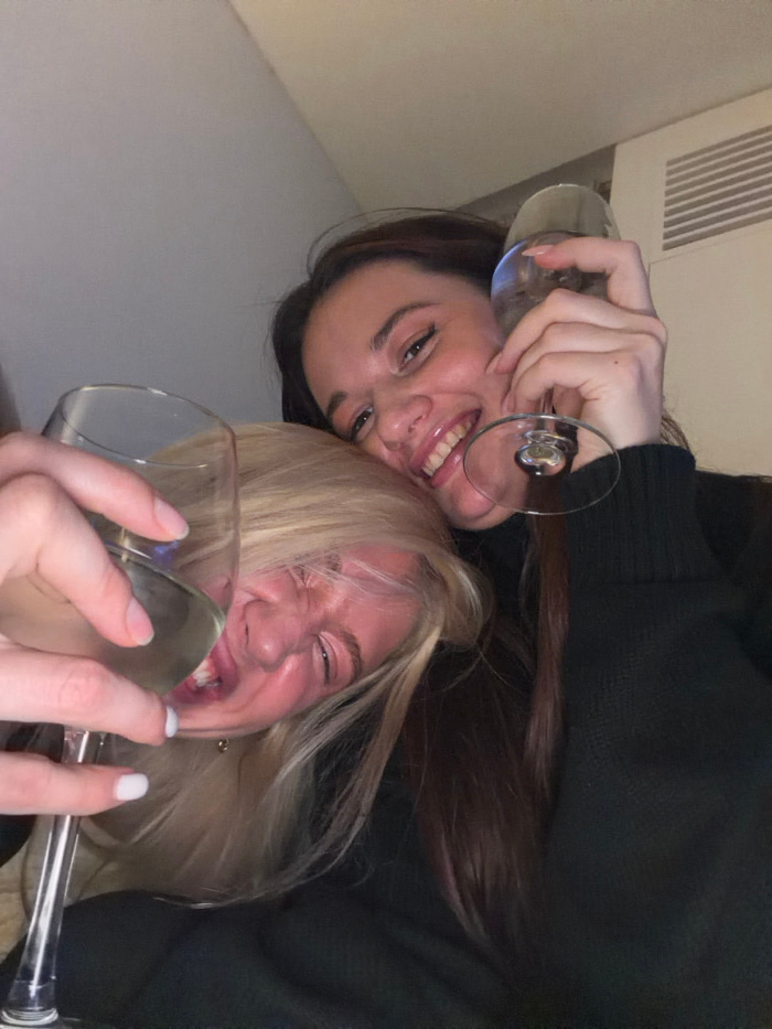 Two women hold wine glasses upside down, smiling. One woman has dark brown hair and a bright, open smile, while the other has blonde hair, squinted eyes, and a more playful grimace. Both are casually…read more