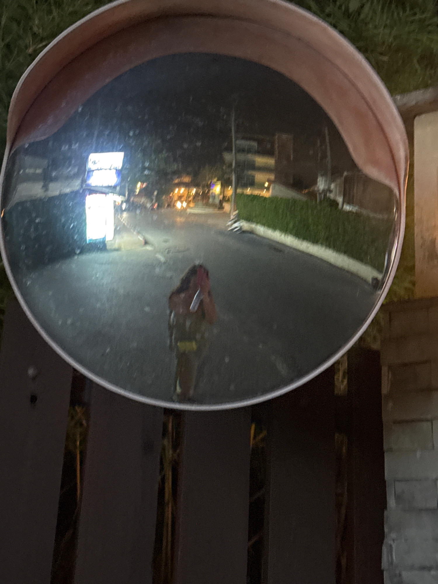 A convex mirror is positioned on or near a dark, horizontal, slatted structure, possibly a bench. The mirror reflects a street scene: buildings are visible in the distance and streetlights illuminate…read more