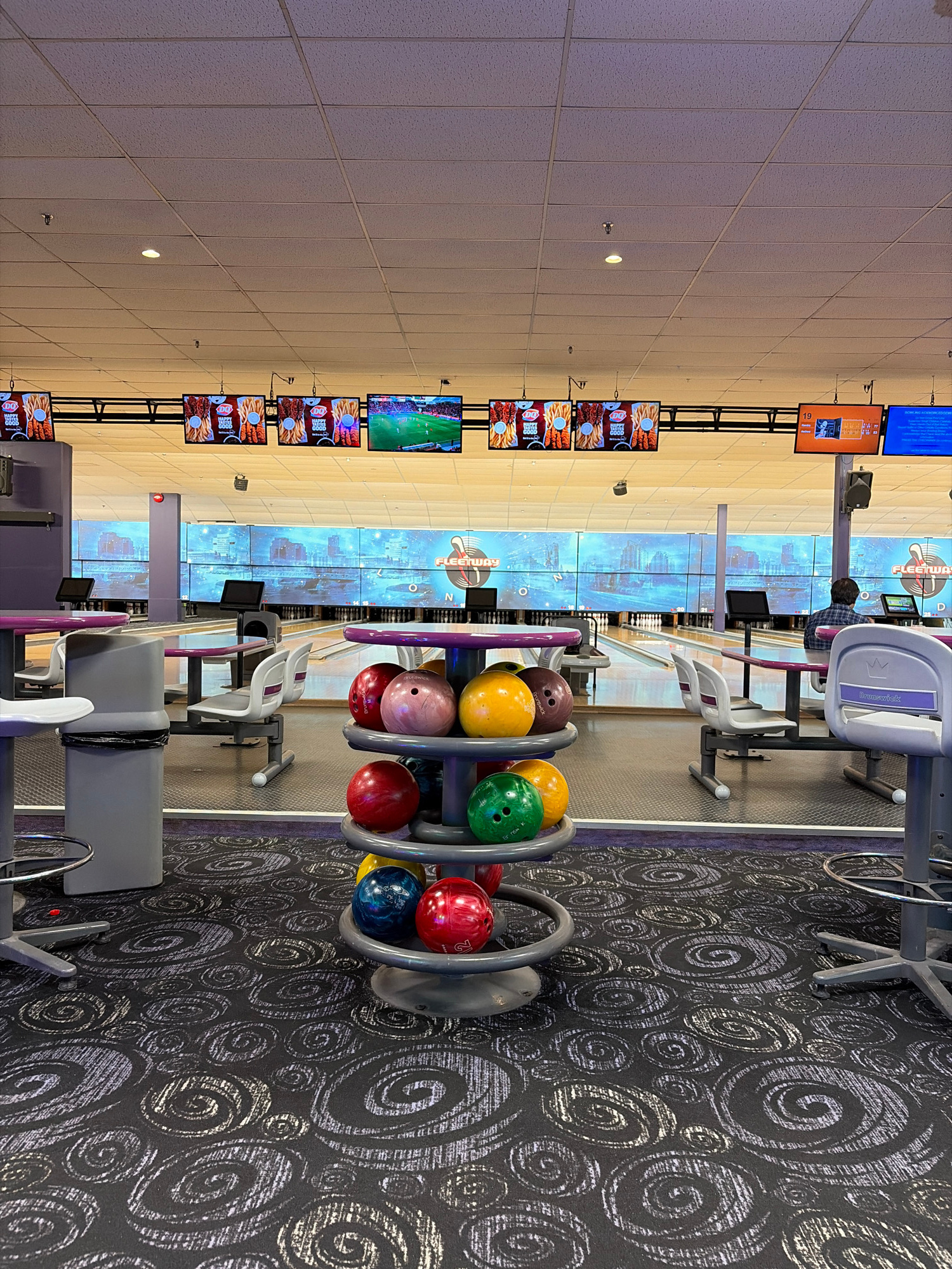 The image depicts the interior of a bowling alley. A rack of bowling balls in various colors stands in the foreground, next to a seating area with bowling chairs. In the background, bowling lanes stre…read more