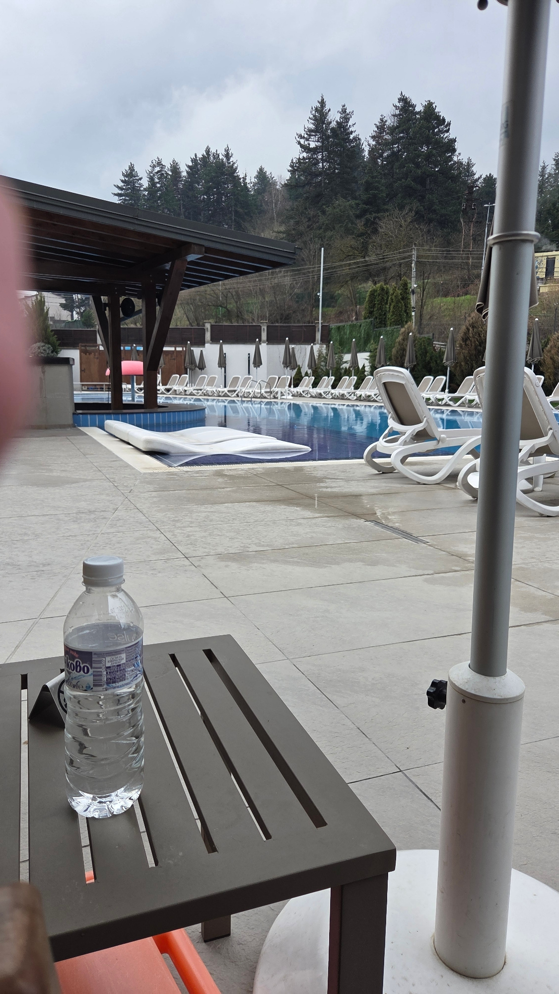 The image shows an outdoor setting next to a swimming pool, possibly a resort or hotel pool area. The location is suggested to be in the city of Bania, Bulgaria. The scene includes a row of lounge cha…read more