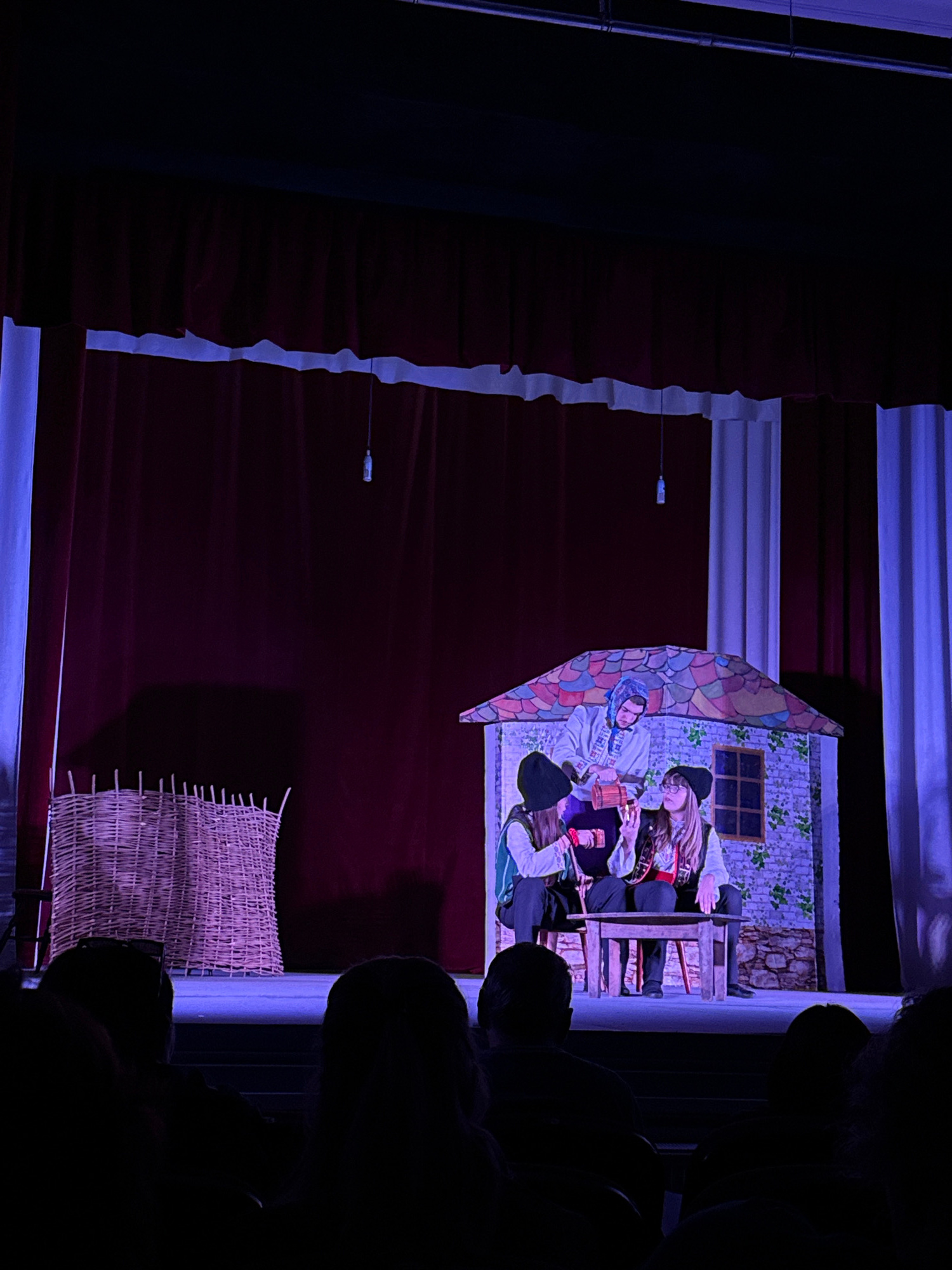 This image captures a theatrical performance, likely a puppet show or play, taking place on a stage in Lukovit, Bulgaria. The scene is illuminated by artificial, predominantly blue and purple lighting…read more