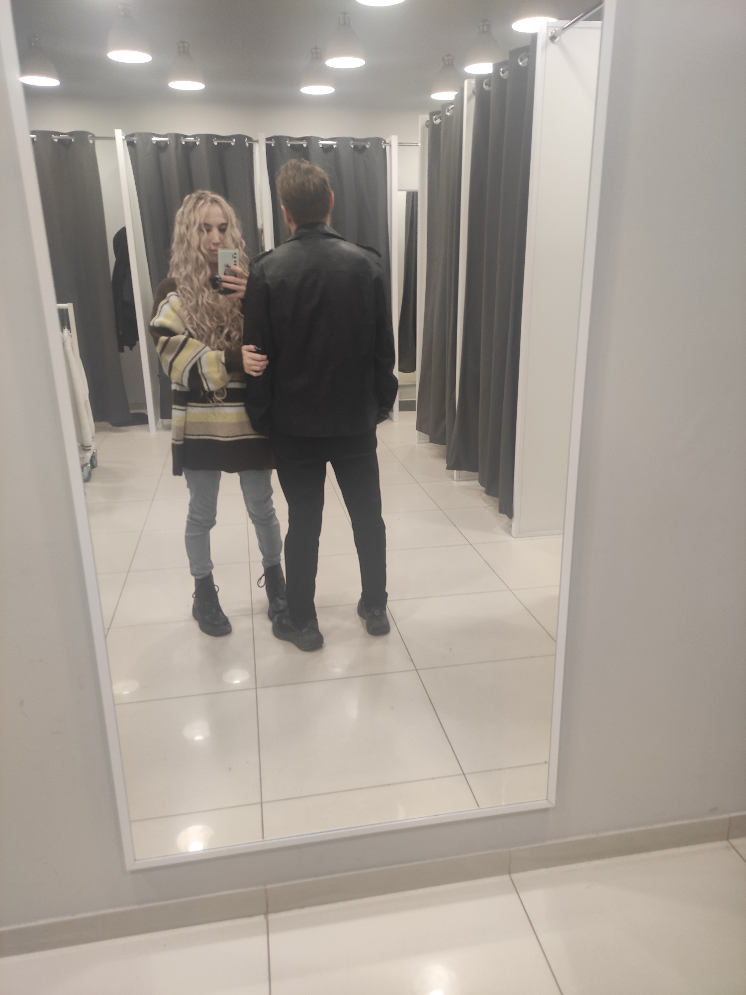 The image shows a reflection in a dressing room mirror. Two individuals are visible: one is a man in a black jacket, standing behind a woman with long blonde curly hair. The woman is holding a smartph…read more