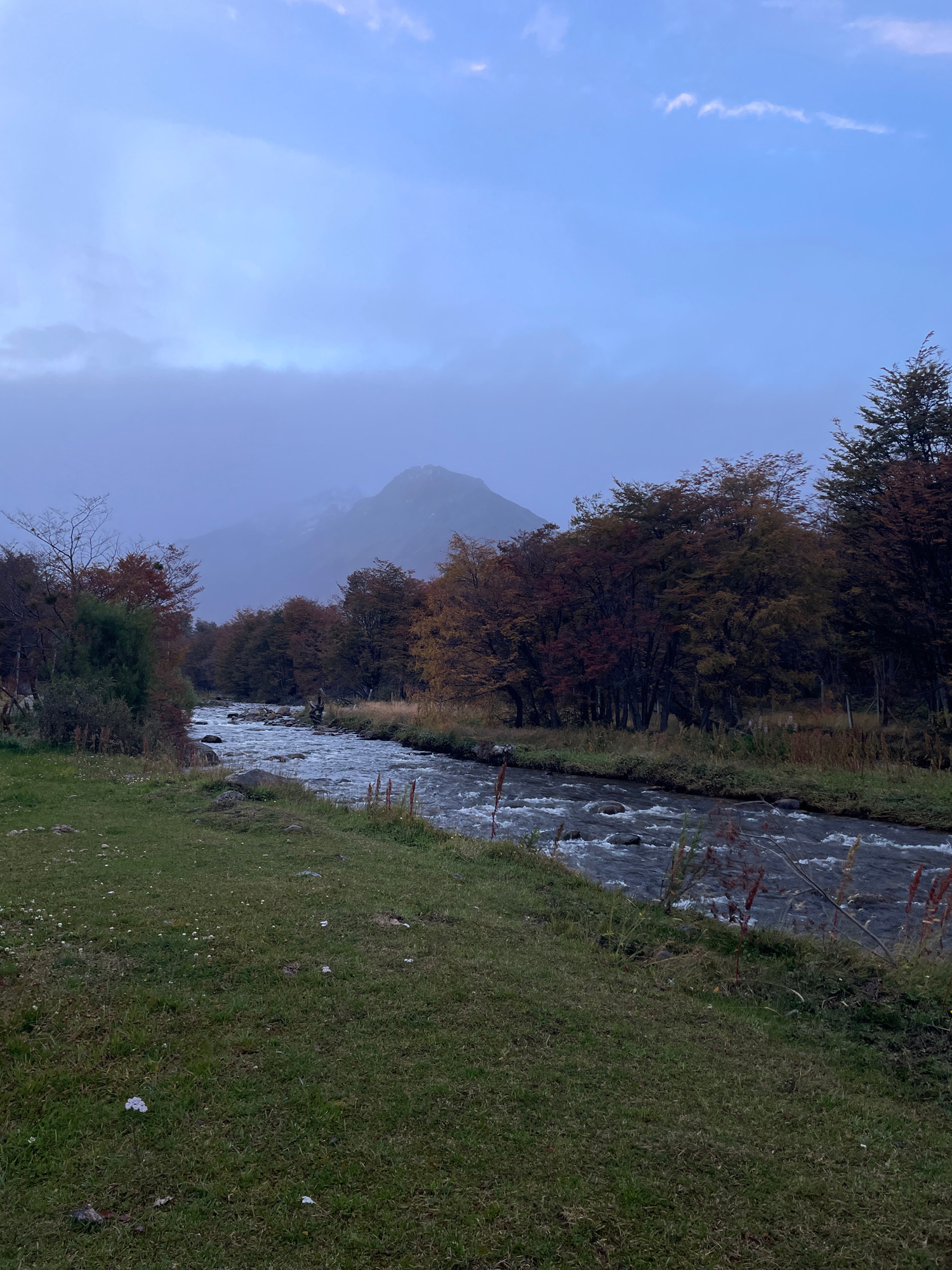 The image shows a river running through a landscape near Ushuaia, Argentina. The river flows from left to right, with trees lining the left bank exhibiting autumn colors. The river is surrounded by gr…read more