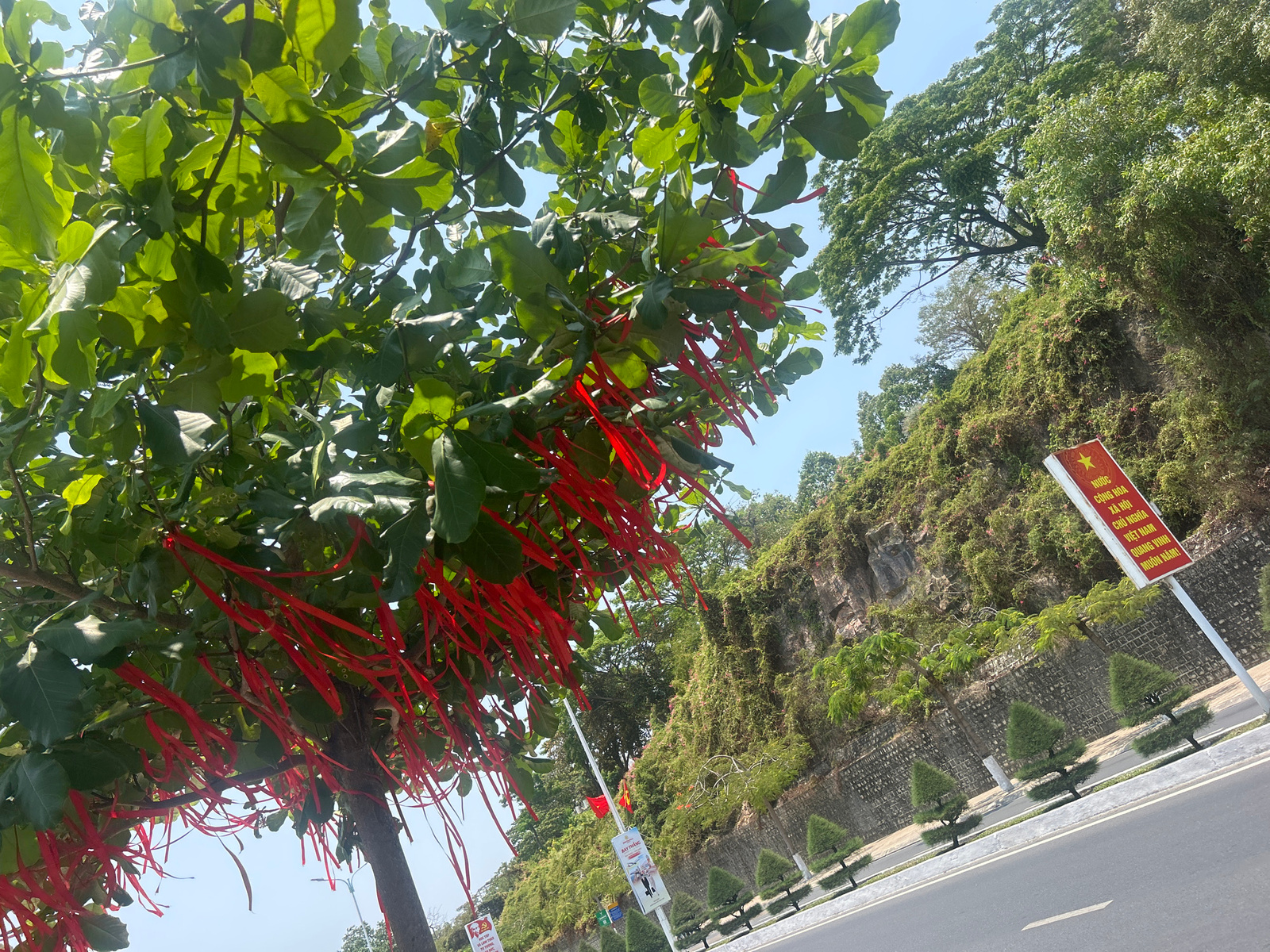 The image depicts a roadside scene in Bắc Nha Trang, Vietnam. A tree with green leaves and many red ribbons hanging from its branches dominates the left side of the frame. The background features a hi…read more