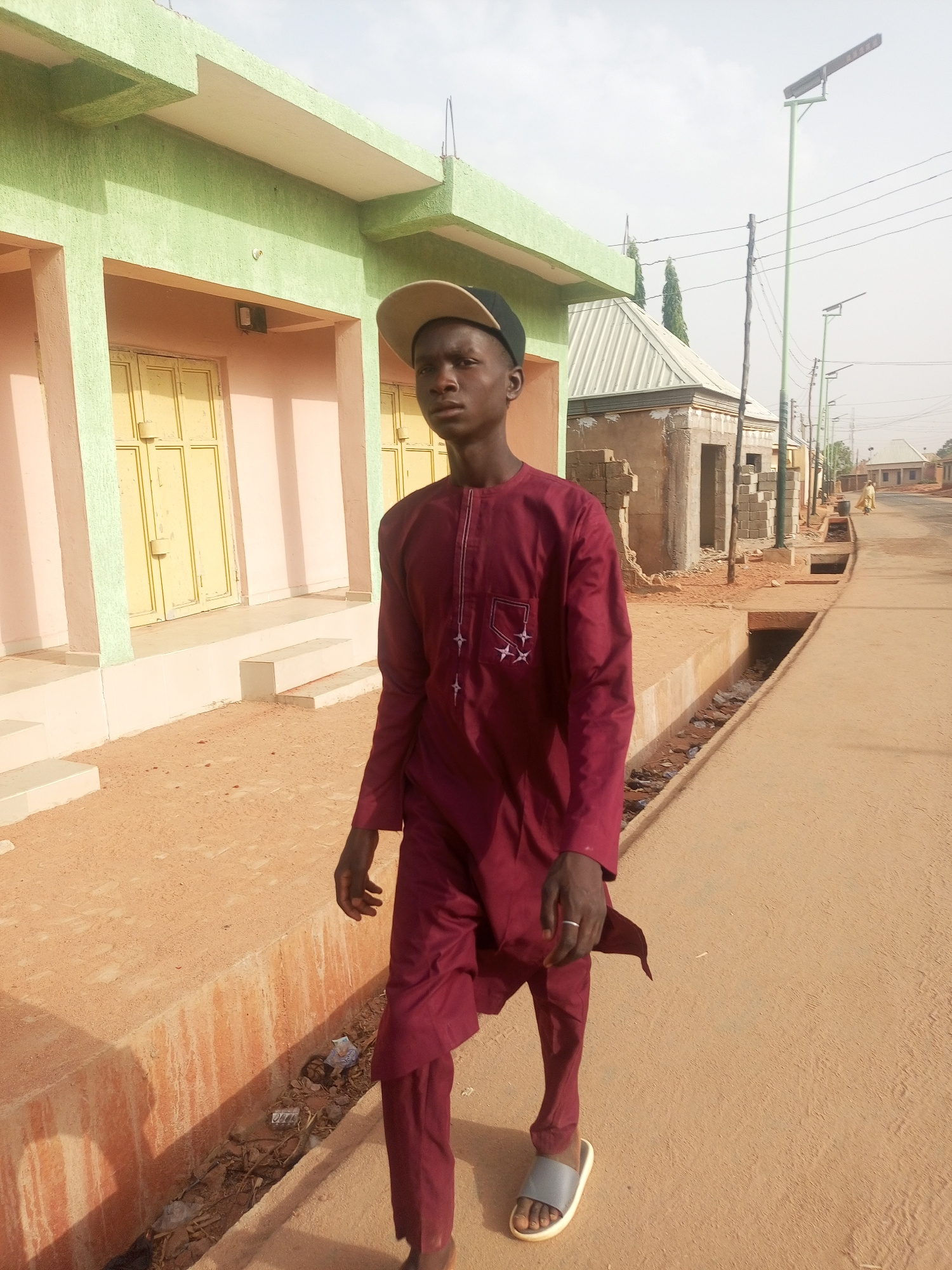 An outdoor scene in the city of Timia, Niger, depicts a young male standing on a raised dirt embankment adjacent to an unpaved road. The male, positioned slightly left of center, wears a beige basebalβ¦read more
