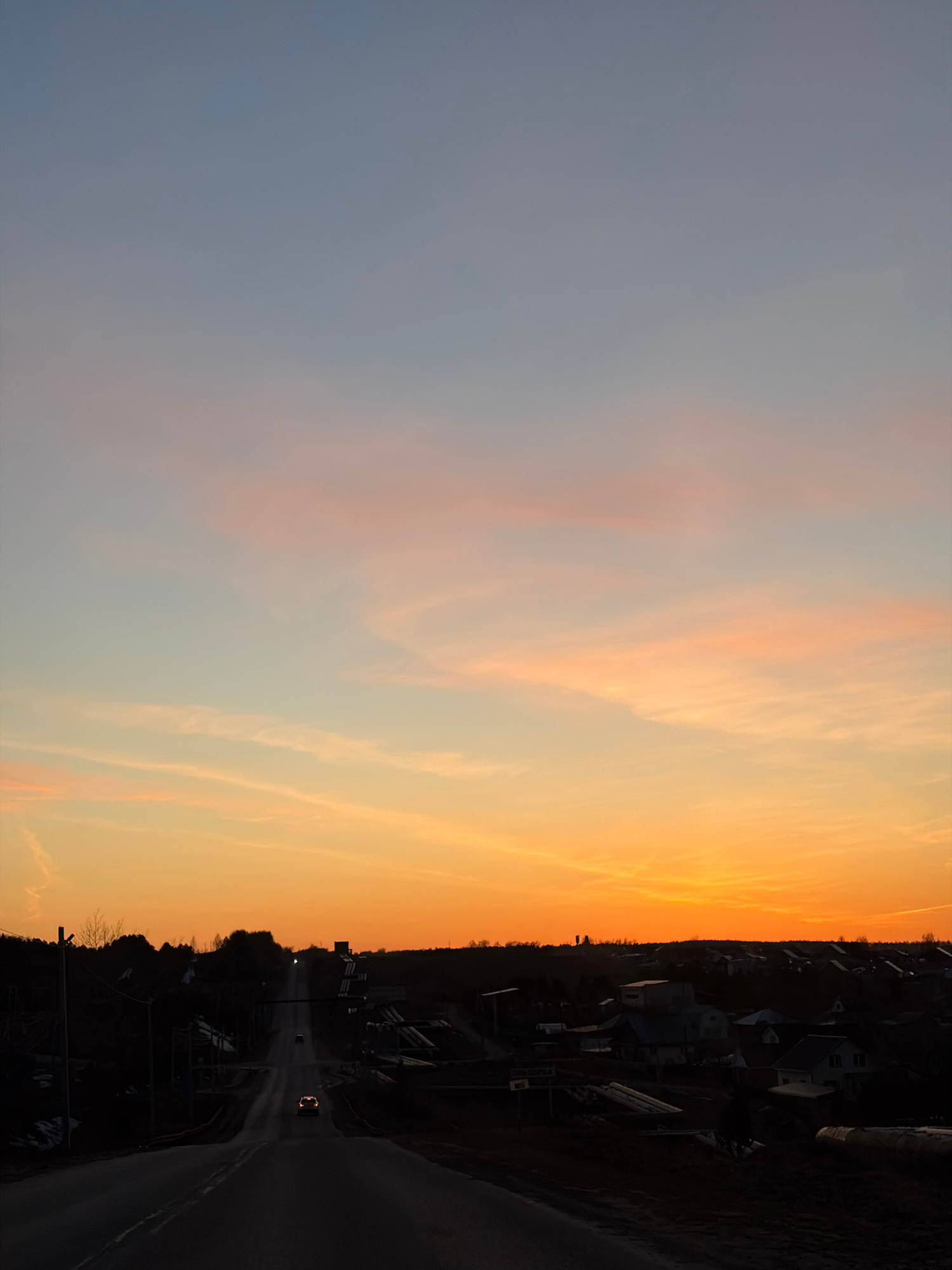 This image captures a tranquil sunset or sunrise scene over a rural or semi-urban landscape in Olkhovka, Russia. The sky dominates the upper two-thirds of the frame, displaying a striking color gradie…read more