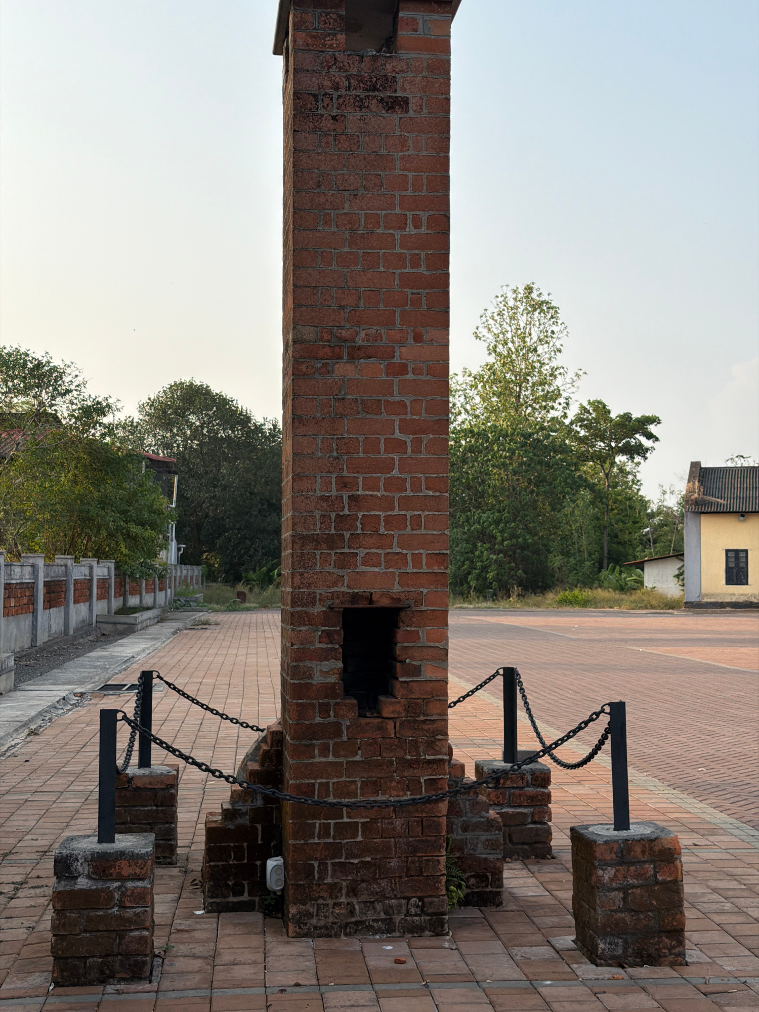The image shows a tall, thick brick structure bisecting the frame, seemingly a section of a wall or a gateway. A rectangular opening is visible in the middle. Black metal posts with chains are attache…read more