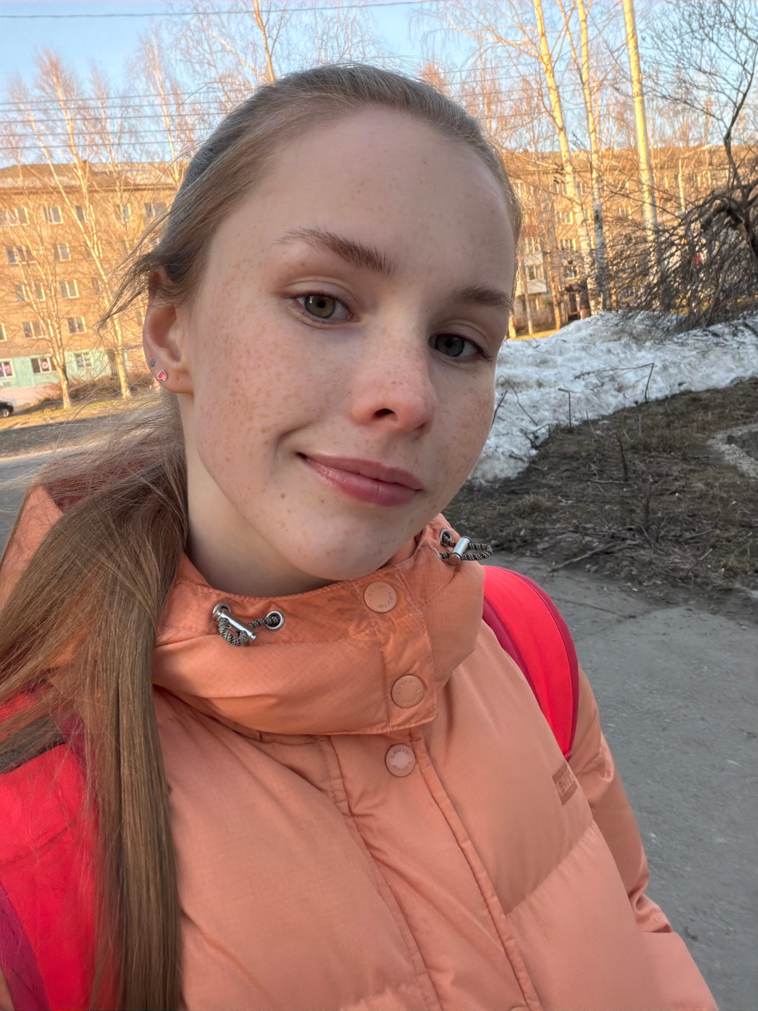 A young, fair-skinned woman with freckles is posing for a selfie. She has light brown hair and is wearing a peach-colored puffer jacket with red accents. The background appears to be an urban environm…read more