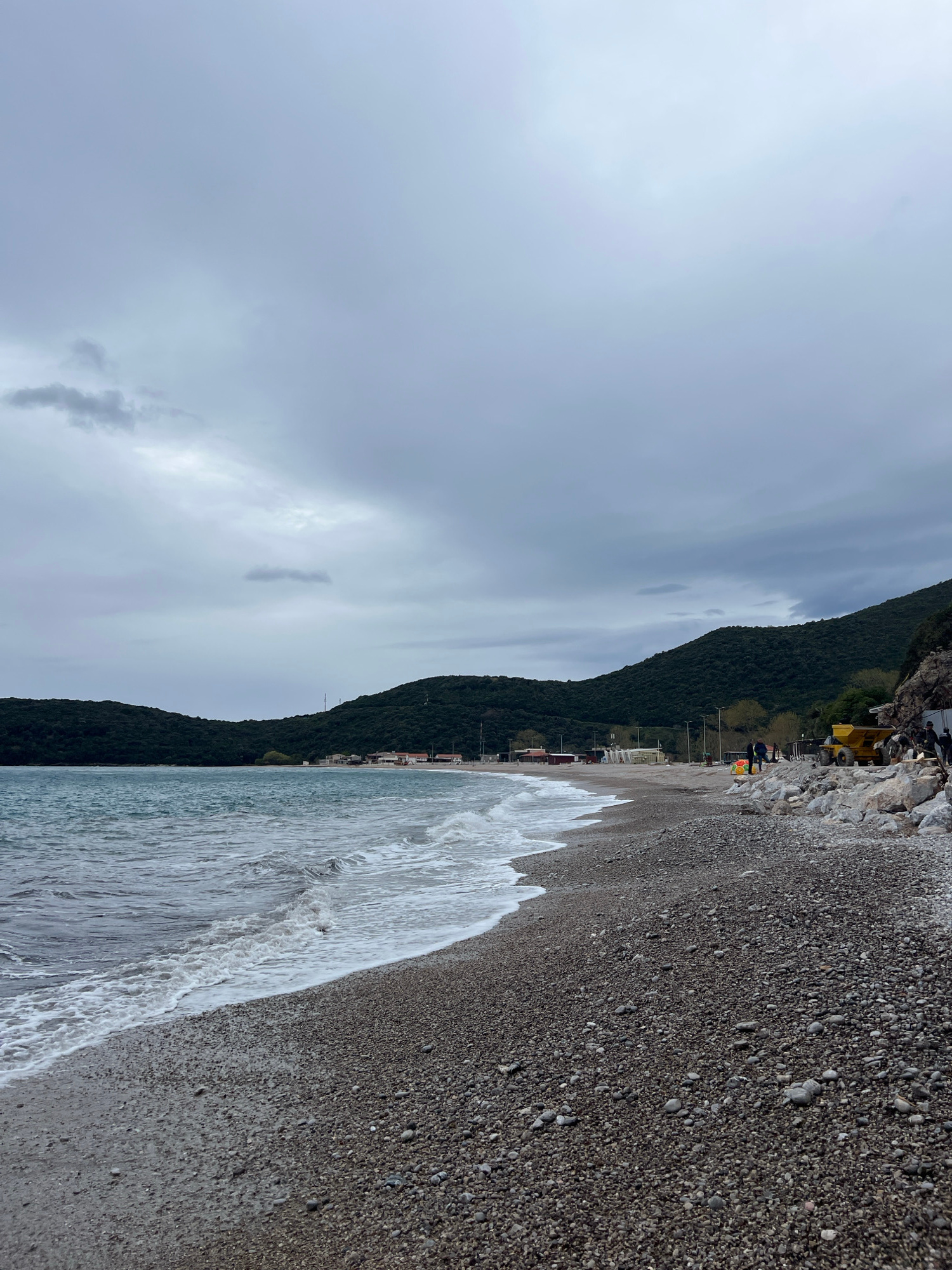 The image shows a coastline in Prijevor, Montenegro under a cloudy sky. A dark, pebble-covered beach meets the water's edge where waves are breaking. Adjacent to the beach, a steep, green, tree-covere…read more